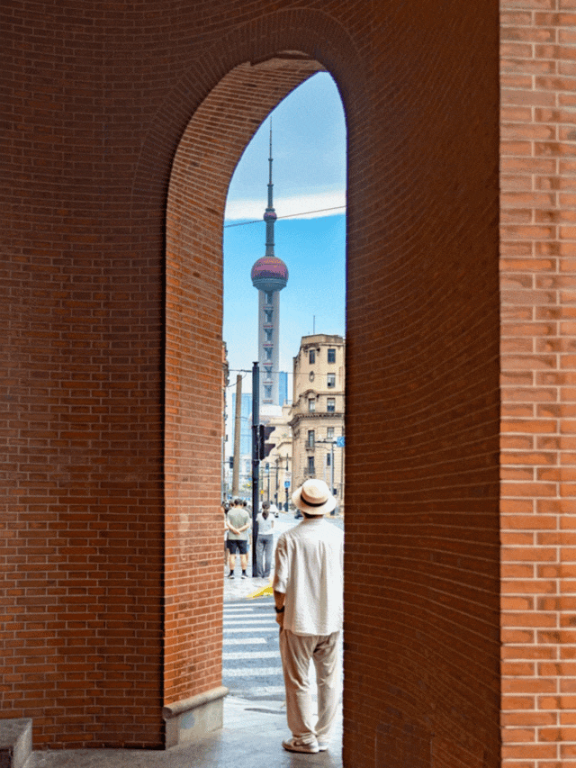 1️⃣ 拱形门洞:大楼的红砖拱门是经典机位,使用长焦镜头,可将远处的东方明珠塔框入画面,形成复古与现代结合的独特景观