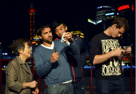 2012年大师赛,颛桥剪纸传承人周若妹和英国球员穆雷等网球大师在外滩共同完成剪纸作品