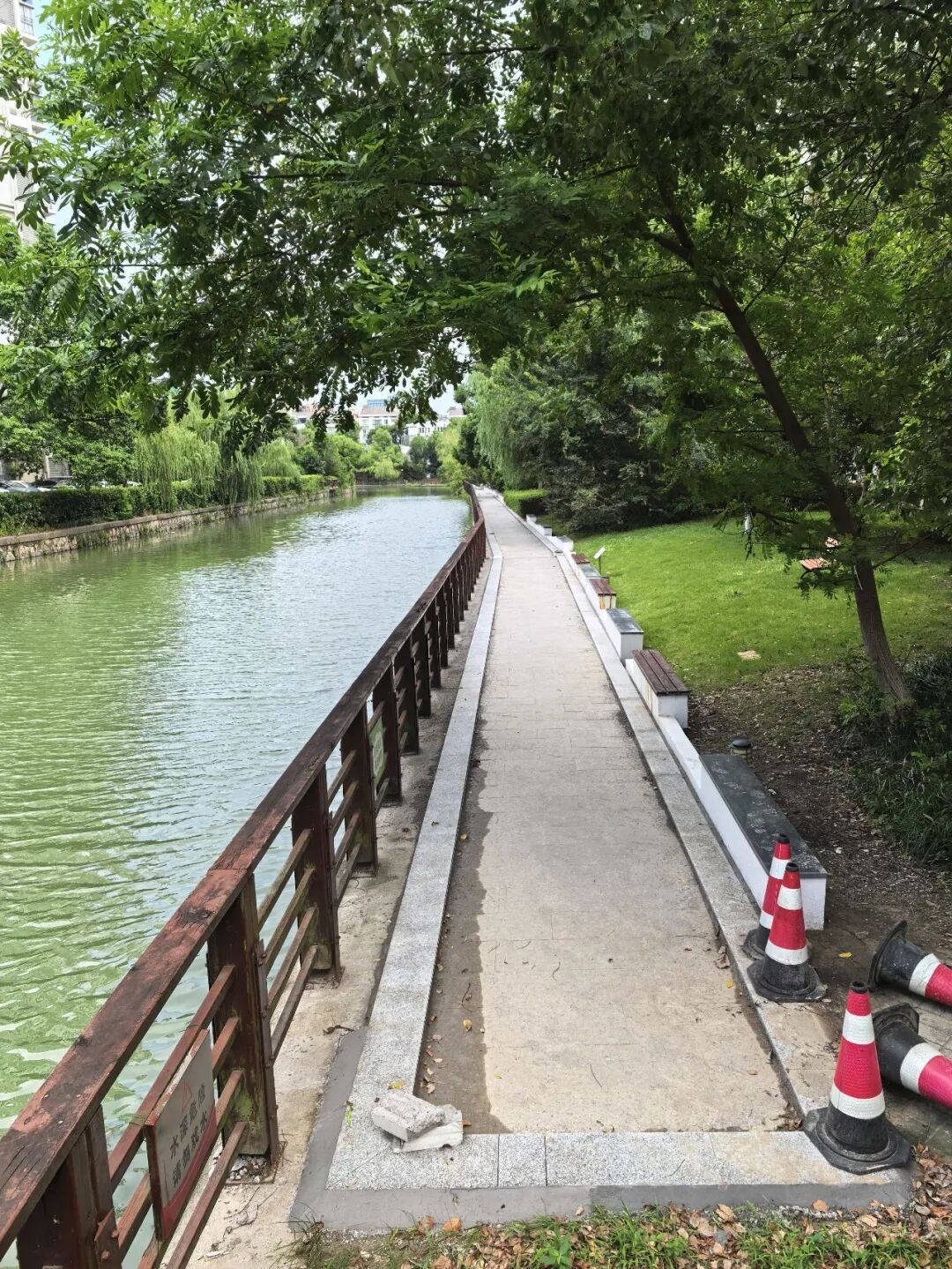 环绕小区的陈家浜河步道因其位置特殊,每逢暴雨就会被淹没。加上建造时间长、材质不耐腐蚀,路面也变得破损斑驳、坑洼不平,居民夜间行走尤其担心摔跤。“步道破损严重,走路都得小心翼翼,特别是下雨天,根本不敢让老人孩子单独出门。”居民曾抱怨。