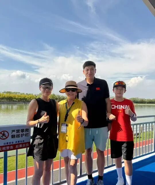范安萍(左二)与常勇平一家三口在2025上海赛艇世锦赛现场