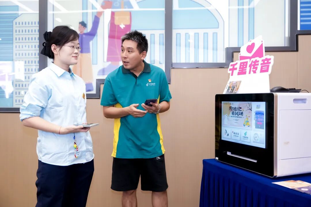 在“千里传音”摊位前,不少骑手由于国庆中秋假期工作不能回家,通过徐汇邮政准备的有声明信片机,寄送了一封别样的“声音家书”,传递对家人的思念。
