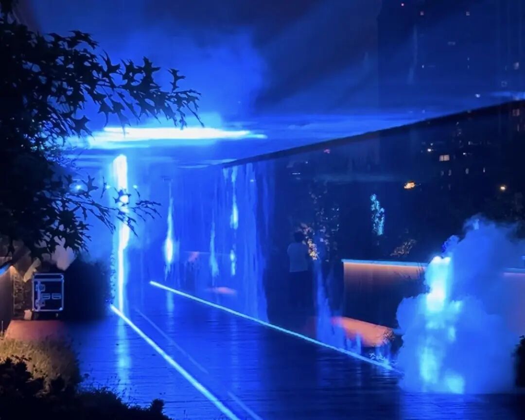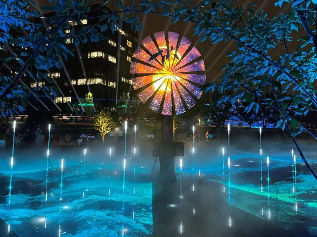 下了栈桥,一处灵动的水景上,风扇屏装置升级回归,结合雾森、灯光立柱、点光源、激光、音响等形成立体式沉浸场景,感受科技感满满的水影互动。
