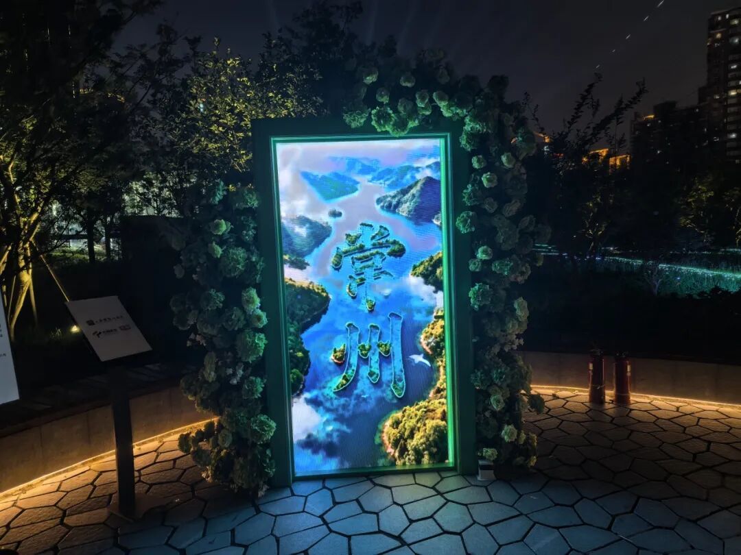 公园内的栈桥一侧,从已经拆除的铜川路水产市场得到灵感,利用第一届光影节保留的“川”字灯光装置为中心,向两侧延展出巨幅LED显示屏,通过艺术造型和数字内容展示海洋生态和星际畅想,唤起普陀曾经的历史记忆和对未来的无限期望。