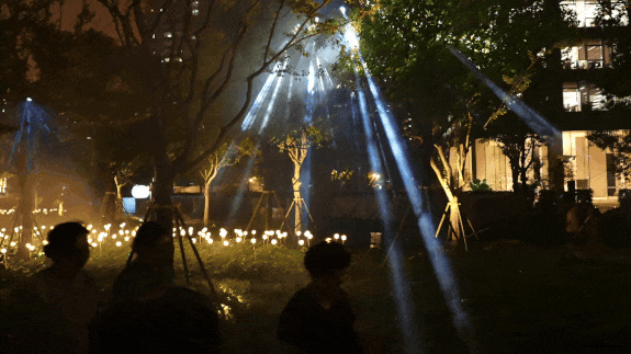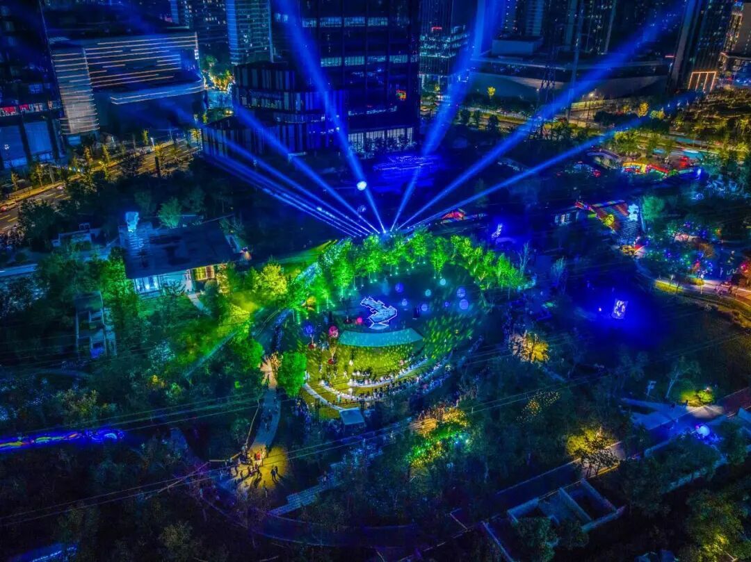 园路边的小树林里,一道道激光透过雾气,氤氲之间产生了丁达尔效应,投下星星点点的光影,十分出片。