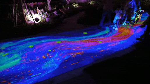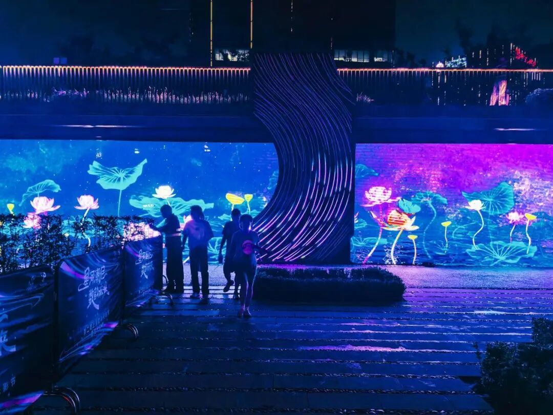 在一段园路上,设置了彩虹投影并配置先进的人体追踪设备,当行人经过时,会在地面投射出以荷花莲叶为元素的阵阵涟漪,仿佛苏州河水在缓缓流淌。