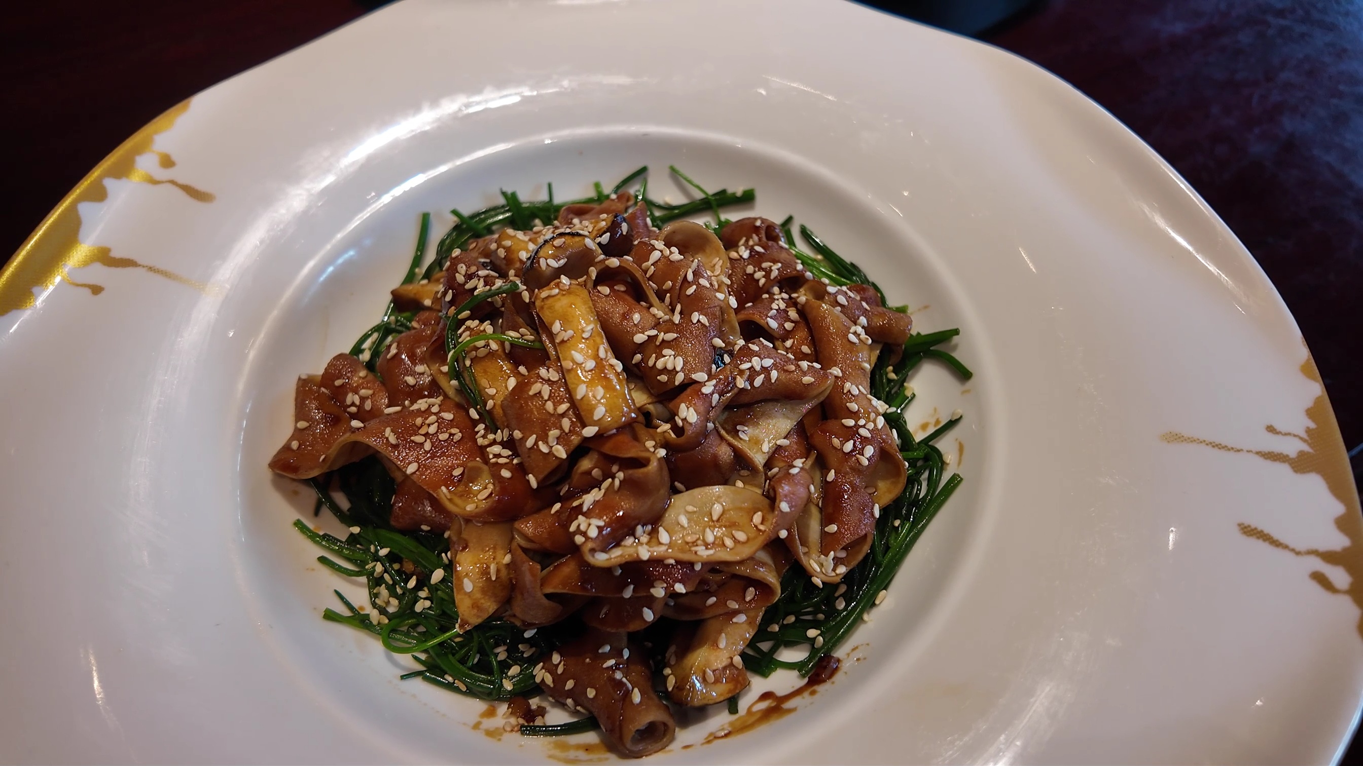 而此次推出的新品中,“沙葱啫狮头鹅肠” 堪称跨界融合的佳作。它将潮汕狮头鹅肠与广式啫啫煲巧妙结合。狮头鹅肠本身宽厚如缎带,是鹅中珍品,每只鹅仅能获取少量,制作过程也颇为费时,在当地就格外珍贵。烹饪时,厨师采用猛火急攻的方式,瞬间锁住鹅肠的水分,最大程度保留其鲜嫩口感。再配上沙葱独特的辛香,不仅有效提升了整体风味,还能化解油腻,进一步激发出鹅肠的脆嫩与鲜美。吃起来,既有鹅肠的韧劲,又有沙葱的野趣,还有辣椒的微辣鲜香,一口下去满嘴烟火气,却又不失本帮烹饪技艺里对食材本味的尊重。