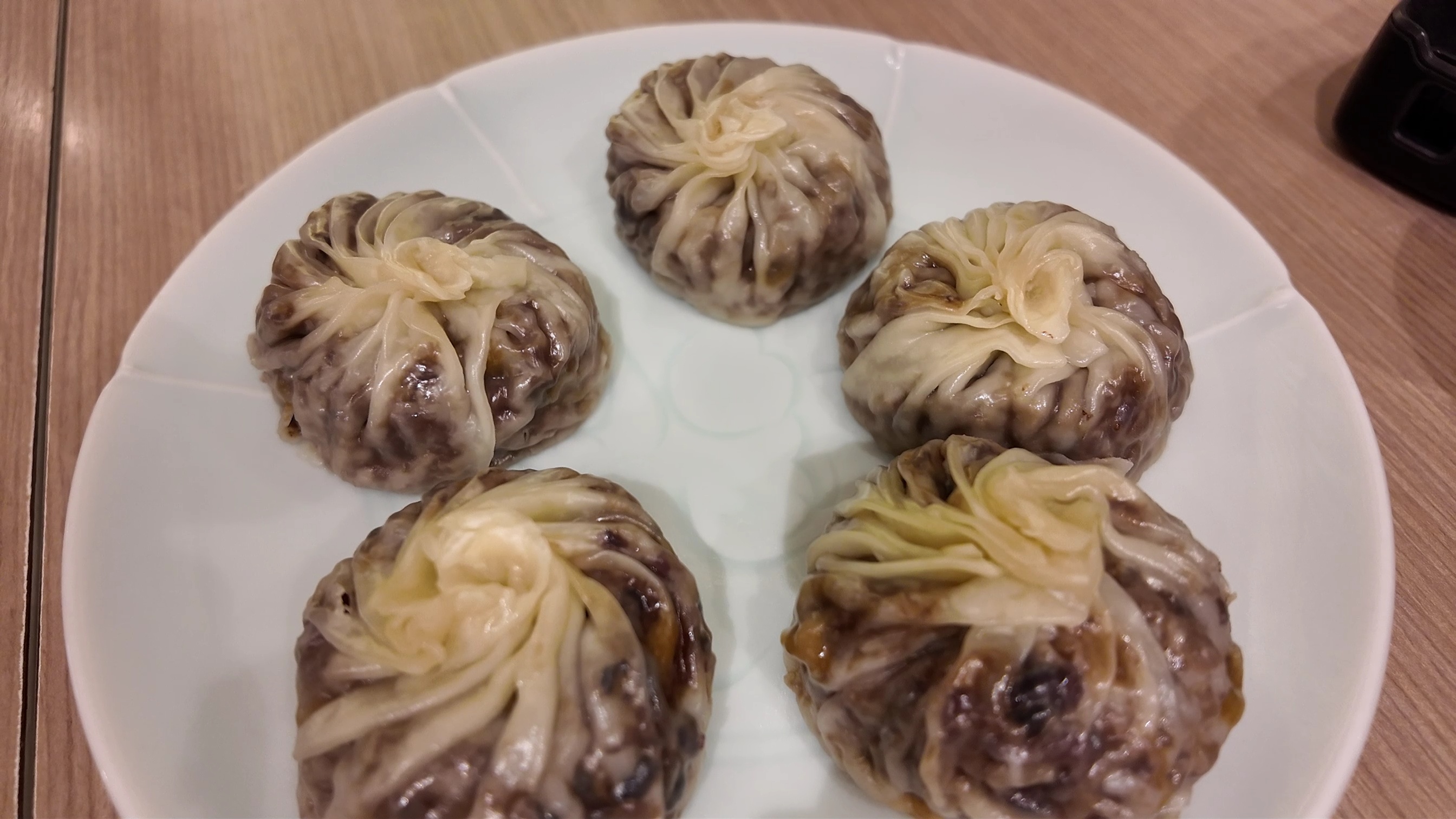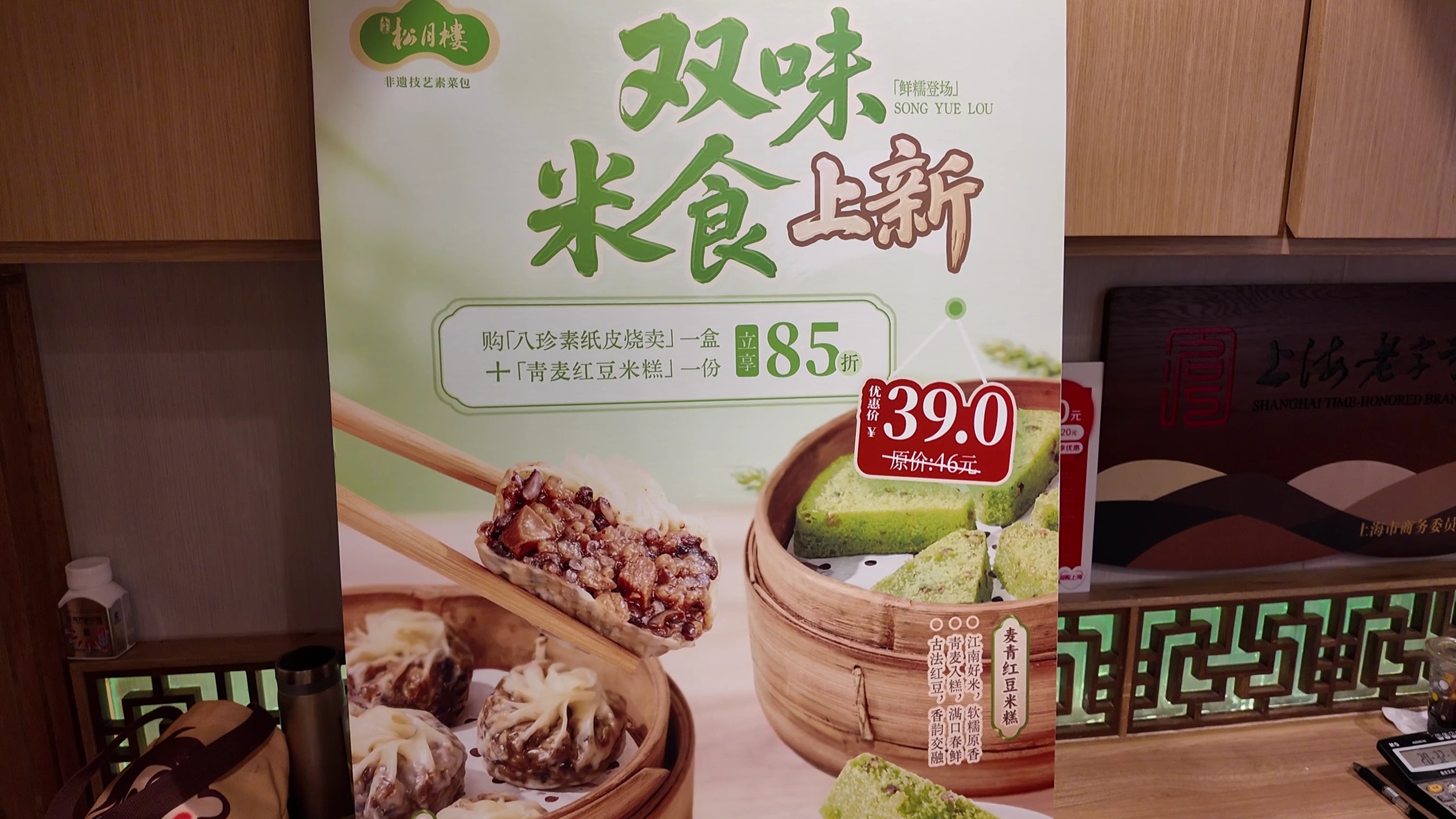 尤其值得一提的是两款点心新品。八珍素纸皮烧麦融合了八种食材,东北糯米搭配七色糙米,包括燕麦米、黑米、紫糯米、荞麦米等,经过4—6小时的浸泡,口感丰富有层次,软糯 Q 弹。烧麦外皮薄如蝉翼,内馅丰满扎实,丝毫不逊色于市面上任何一款烧麦。麦青红豆米糕则是时下流行的糕点,松月楼选用优质红豆、广西陈年老冰糖等,再加入上海产的麦苗浓缩汁,颜色翠绿诱人,清新香甜。店员介绍说这两款双味米食新品一推出就受到了新老顾客的欢迎,给大家带来了不一样的素食新体验。