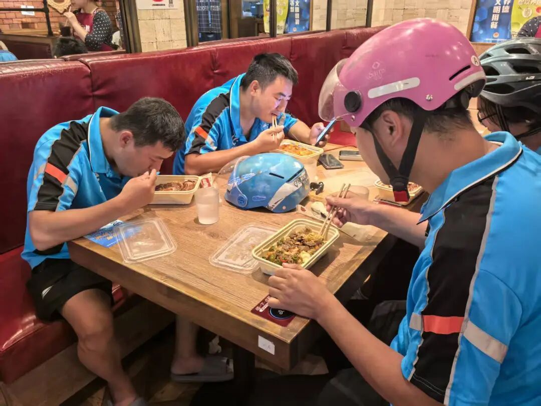 外卖员们围坐在一起,吃起了肉酱芝士意大利面、 海鲜炒饭、烤鸡排、牛肉炒饭。这些藏着方言温度与节日心意的美食,既是商户对奔波者的深情回馈,更让新就业群体在团圆佳节,感受到了上海弄堂最鲜活的温情。