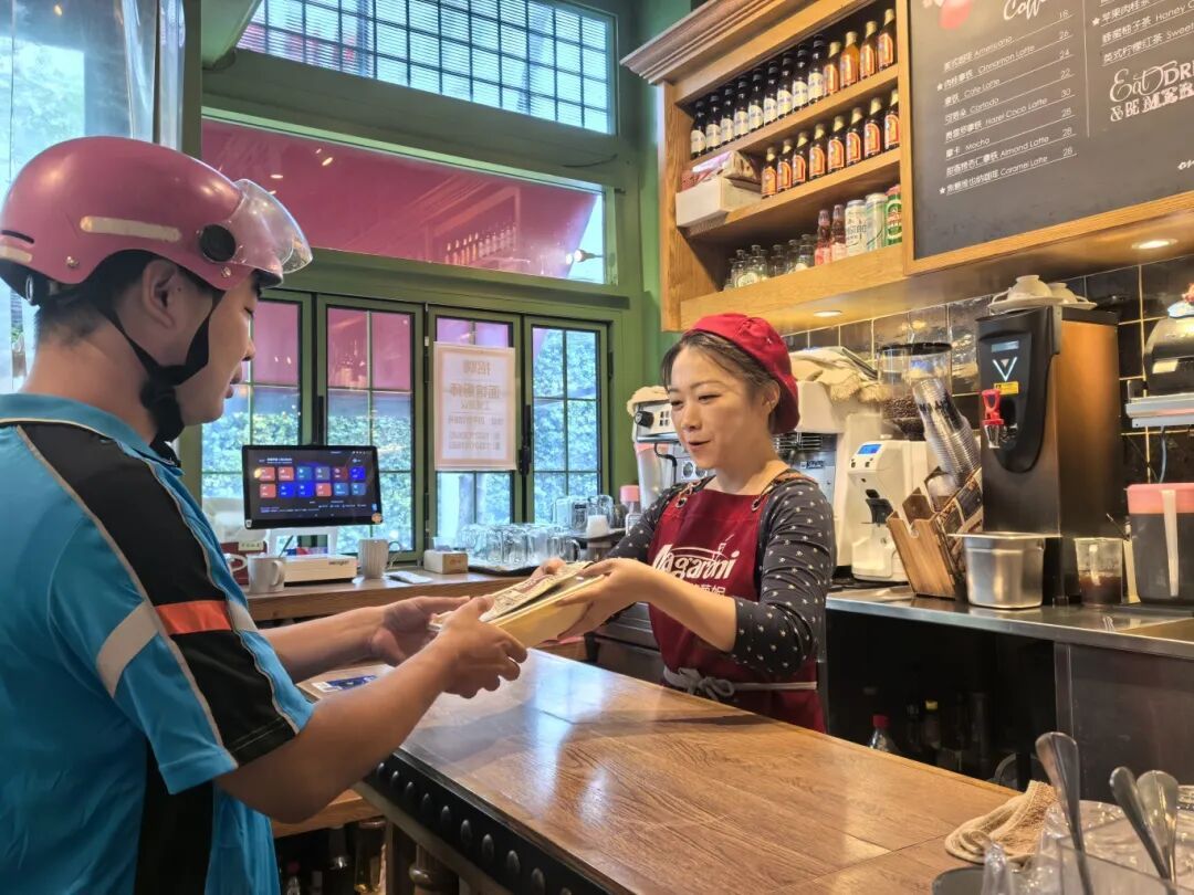 中午,外卖员赵雨来到位于昆山路的玛格萝妮餐厅。这次他不是来拿外卖的,而是用一句在北外滩街道新就业群体休憩服务驿站“乍物社”学习到的“沪语暗号”,兑换了一份“美食盲盒”。