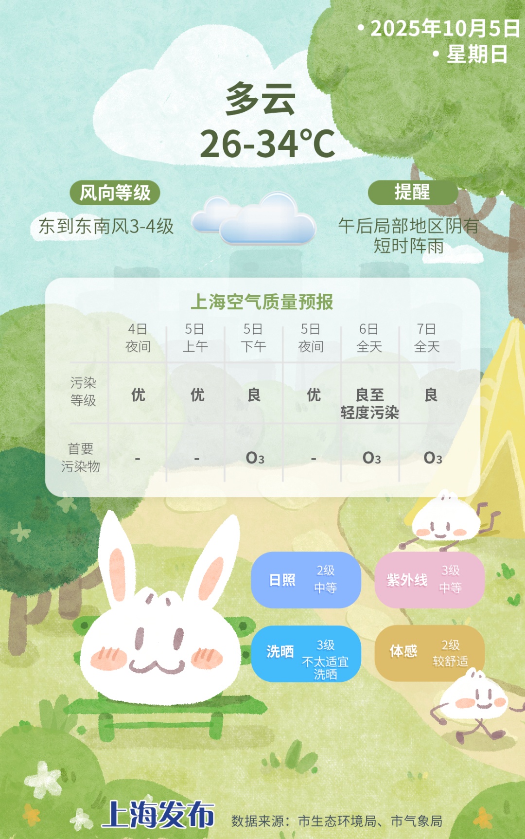 今日回顾 今天申城起步气温不高,在21~25℃之间。午后阳光加码,升温加速,各区最高气温达到28~31℃,其中徐家汇站30.0℃,反超昨日,体感闷热。 明日天气 随着副热带高压西伸加强,明起本市再启一轮升温过程!预计明天最高气温可达34℃,最低26℃,多云为主,东到东南风3~4级,相对湿度95%-55%,又是“晴、热、晒”的熟悉配方。午后局部可能出现短时阵雨,对出行影响不大。建议朋友们备好晴雨伞,防雨防晒都用得上。 天气趋势 本轮升温的巅峰在明后两天,最高气温均可达34℃左右,接近高温线,同时可能会出现短时阵雨,是“下开水”的体感,大家一定要继续做好防暑降温措施。随着弱冷空气渗透南下,假期最后一天(8日)最高气温微降至31℃左右。近期总体天气以多云或阴为主,偶有阵雨串场,请大家及时关注最新预报。 今年第21号台风“麦德姆”今天凌晨加强为台风级,今天下午16时位于距离广东省湛江市徐闻县东偏南方向约530公里。预计,“麦德姆”将以每小时30公里左右的速度向西偏北方向移动,并将于5日上午在广东电白至海南万宁一带沿海登陆(台风级或强台风级)。4日14时至5日14时,海南岛中北部、广东西南部等地部分地区有大到暴雨,海南岛东北部局地有大暴雨(100-220毫米)。有去往当地计划的朋友,请密切关注天气,及时调整行程。 明日天气 未来几日天气 10月6日(周一):多云,午后局部阴有短时阵雨转多云,26~34℃ 10月7日(周二):多云到阴有短时阵雨,27~33℃ 10月8日(周三):多云到阴转多云,25~31℃ 10月9日(周四):多云到阴有短时阵雨,25~31℃