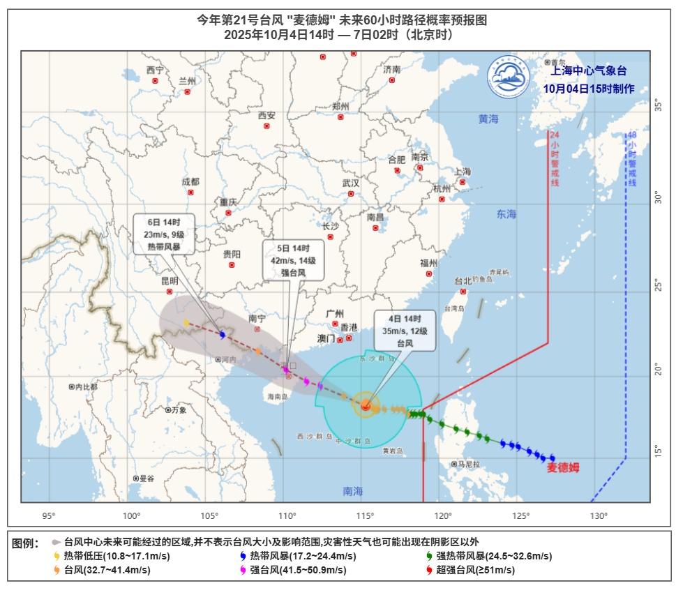 今年第21号台风“麦德姆”4日凌晨加强为台风级,4日下午16时位于距离广东省湛江市徐闻县东偏南方向约530公里。预计,“麦德姆”将以每小时30公里左右的速度向西偏北方向移动,并将于5日上午在广东电白至海南万宁一带沿海登陆(台风级或强台风级)。4日14时至5日14时,海南岛中北部、广东西南部等地部分地区有大到暴雨,海南岛东北部局地有大暴雨(100-220毫米)。有去往当地计划的朋友,请密切关注天气,及时调整行程。