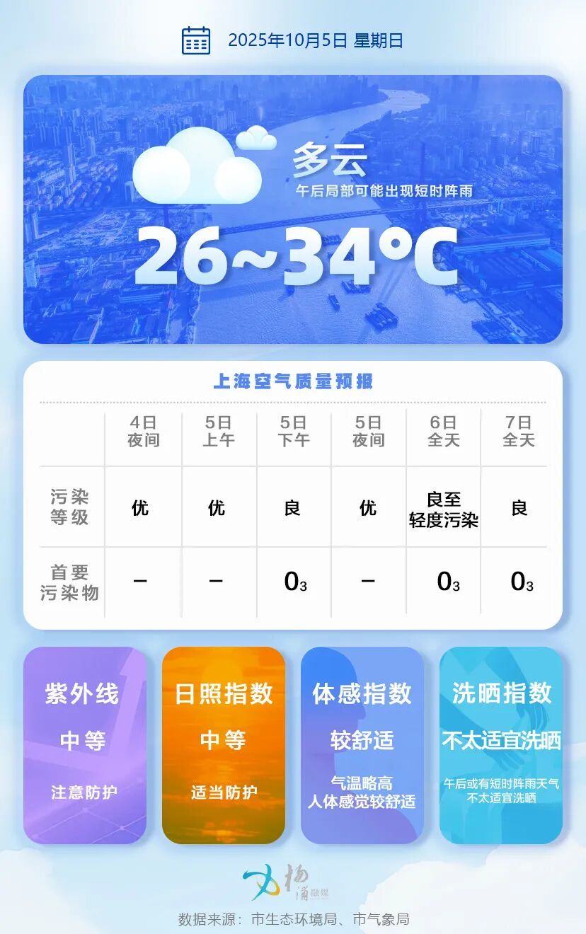 随着副热带高压西伸加强,今天起本市再启一轮升温过程!预计今天最高气温可达34℃,最低26℃,多云为主,东到东南风3~4级,相对湿度95%-55%,又是“晴、热、晒”的熟悉配方。午后局部可能出现短时阵雨,对出行影响不大。建议朋友们备好晴雨伞,防雨防晒都用得上。