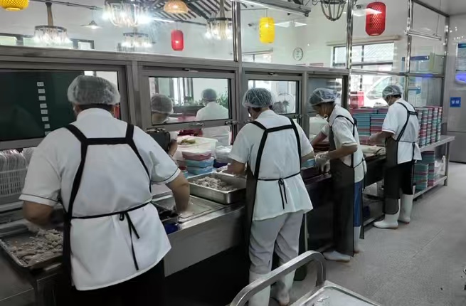 上午9点半,崇明区竖新镇油桥村社区长者食堂的后厨早已一片忙碌景象。灶台前,厨师杨师傅正在忙碌地准备着当天的菜肴,随着最后一道葱油鸡腿新鲜出炉,当天午餐的备餐工作顺利完成。紧接着,分餐阿姨们手脚麻利地将山药肉片、地三鲜、葱油鸡腿和紫菜汤分装进保温餐盒。