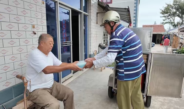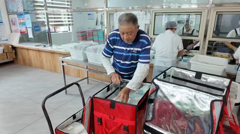 打包完毕后,送餐员袁师傅迅速将餐盒整齐码放进保温箱,随后骑上电动车自行车,开始了送餐服务。10点刚过,袁师傅准时抵达袁老伯家门口。接过餐盒的袁老伯回到屋内,立即打开吃上了热乎的饭菜。“国庆假期,送餐员们也天天送饭,真的很感谢。”袁老伯说。
