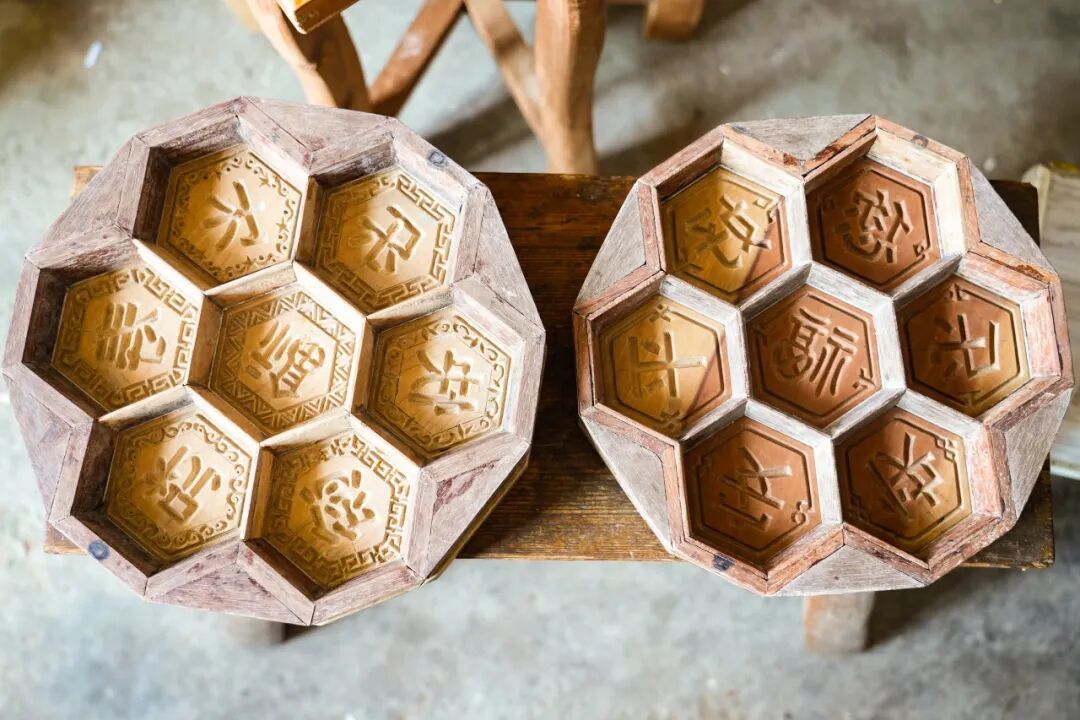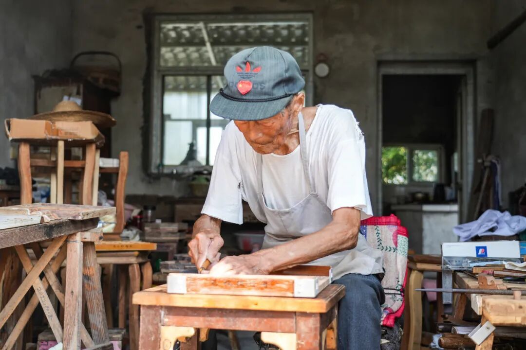 在柘林,每逢佳节或喜事都有制作、品尝方糕的习俗,方糕上呈现的各式花纹和文字蕴含着人们最朴素的憧憬和希冀。这些花纹和文字来自于制作方糕所使用的模具,它们也同样承载着雕刻匠人的精湛技艺与细腻匠心。来自兴园村的91岁工匠蔡忠华,便是这份温情的具象化守护者。他手中的刻刀,将深厚的文化印记镌刻于一方方温润的木模之上,守护着这份独特的甜蜜传承。