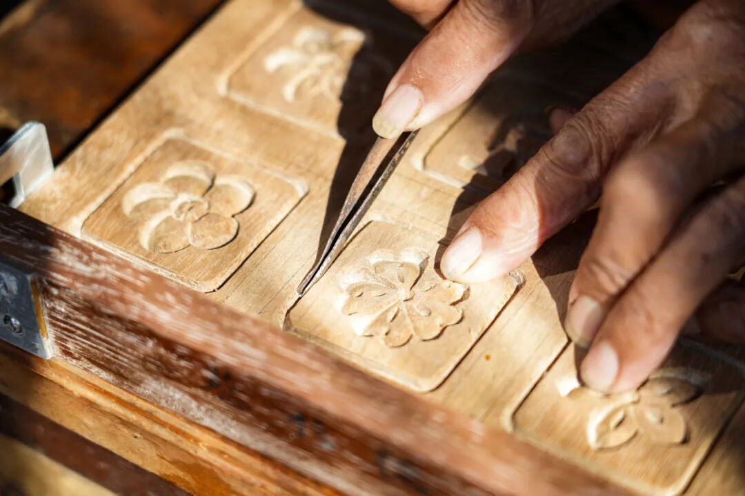 模具的雕刻也极大地考验工匠的手艺。“纹路要清晰流畅,既要保证美观,又要确保蒸糕时热气能够均匀渗透。雕刻时要全神贯注,因为一旦刻坏了就很难修复了。”蔡忠华说道。随着他一刀一落之间,线条流畅的精美图案便渐渐在木料上清晰呈现。