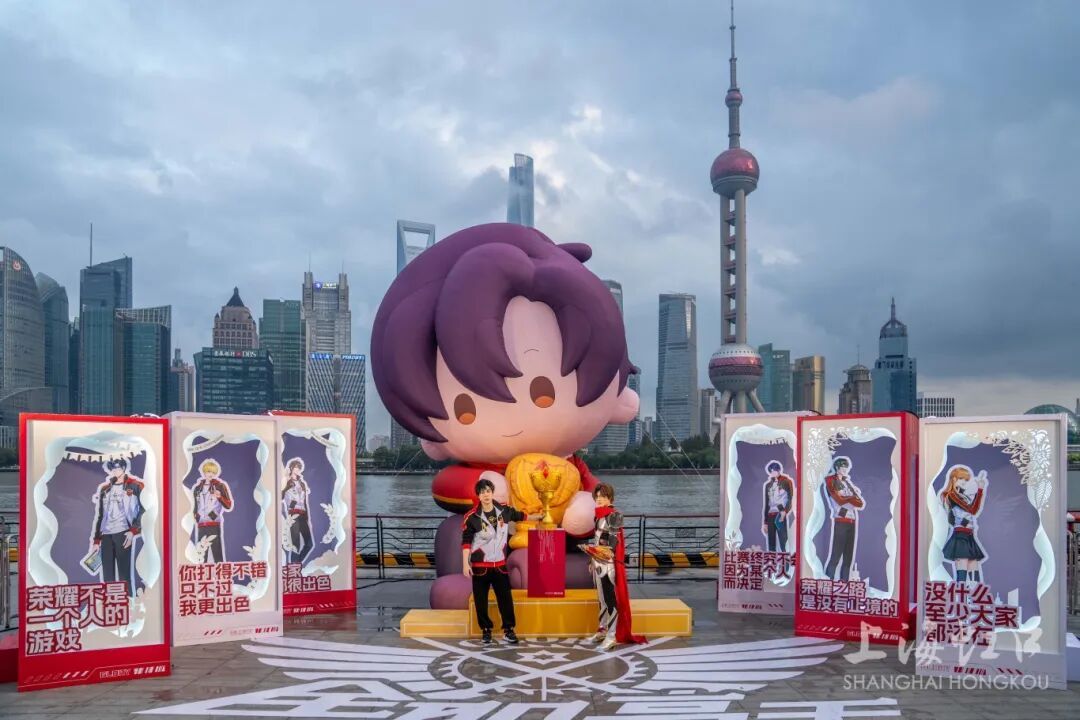 在《全职高手》展台,巨型叶修气模和熠熠生辉的巨大“荣耀奖杯”雕塑闪着光芒,将游客带入充满热血与梦想的电竞世界。