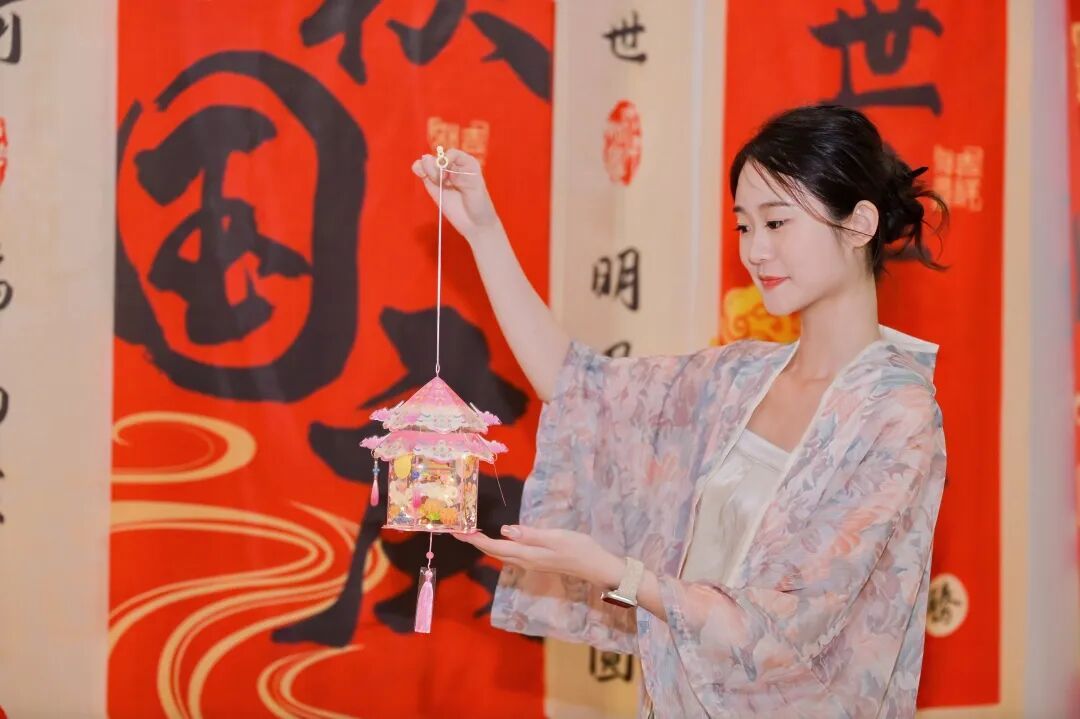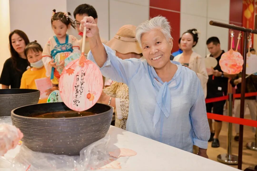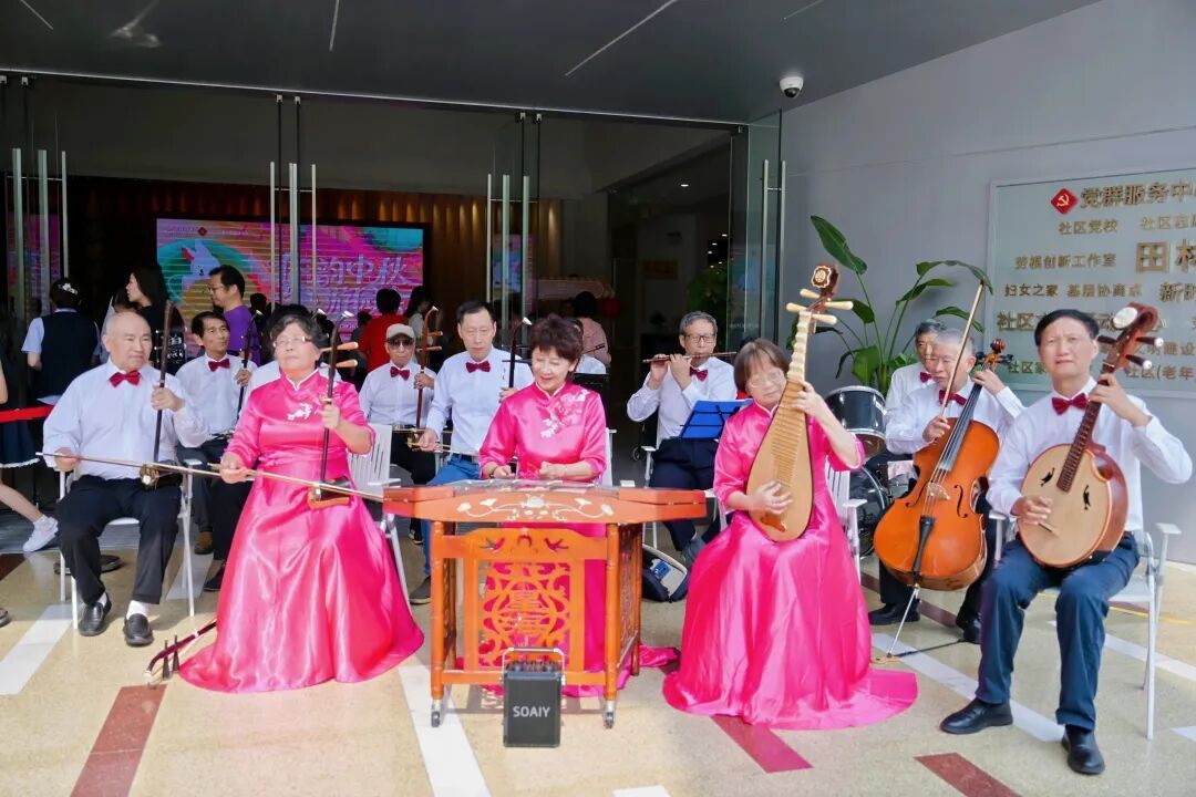 红枫民乐队奏响经典曲目《花好月圆》,悠扬的丝竹声拉开了中秋游园的序幕。现场,居民可在素白扇面上体验漂漆技艺,参与中秋限定徽章、玉兔花灯的制作;上海师范大学志愿者则在墨香挂件上书写“团圆”“平安”等字样,将美好祝愿融入笔墨之间。深度体验区内,亲子家庭共同学习传统竹编技艺,尤克里里彩绘活动则将艺术创作与音乐元素相结合,进一步丰富了文化体验维度。
