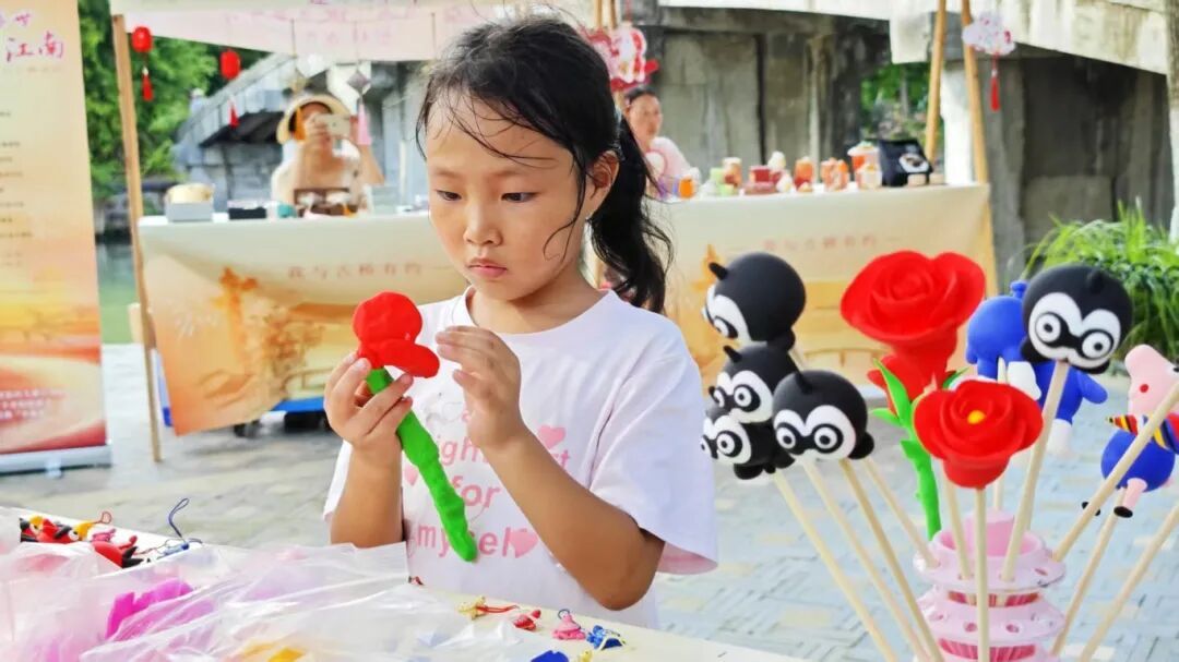 在如意桥至迎祥码头一带,各色非遗、民俗展示摊位错落有致地排开。捏面人的老师傅指尖翻飞,不消片刻,一个个生动鲜活的人物形象便在掌中诞生,孩子们围在摊前,眼睛里闪着好奇的光。还有各式香囊、香薰、冰箱贴等文创周边,福字、花鸟、生肖图案应有尽有,游客们一边细细挑选,一边向摊主请教着每种造型的寓意。河道里摇橹船缓缓划过,橹声咿呀,桨影摇曳,与岸边的市集烟火相映成趣。