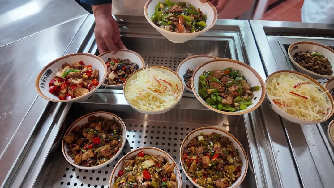 火宫殿工作人员热情地介绍:“我们这儿有各种经典小吃,像臭豆腐、糖糍粑粑,还有著名的湘菜,比如辣椒炒肉、猪血丸子炒腊肉、小炒黄牛肉等。我们的腊肉都是来自湖南本地的特色食材,黄牛肉也是新鲜现炒的,口味就是地道的湖南香辣味。”