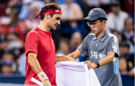 2019年上海大师赛四分之一决赛上,潘清逸作为球童为费德勒递毛巾