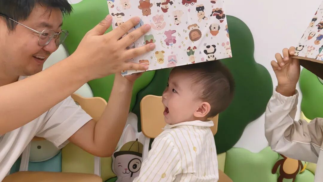 在专门为养育照护小组打造的“小小象健康家”活动室内,爸爸妈妈和宝宝开始了一场“躲猫猫”游戏。“宝宝猜猜,爸爸妈妈在哪儿呀?”“找到啦!”只见爸爸妈妈们与宝宝面对面坐下,拿起小毛巾遮住自己的脸,宝宝好奇地伸手拨开毛巾,家长缓缓放下毛巾,露出笑脸。