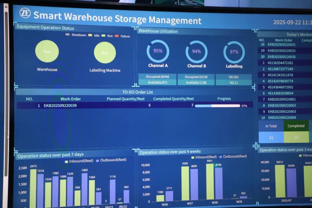 站在智能云仓的可视化屏幕面前,采埃孚汽车系统电子工厂厂长肖宏向记者介绍,智能工厂构建了以数据驱动为核心的智能仓储物流体系,集成WMS、智能云仓、AGV/AMR及RFID等关键技术,使得工厂的空间利用率因高密度存储提升超过250%,出入库效率通过精准化操作提升近50%。