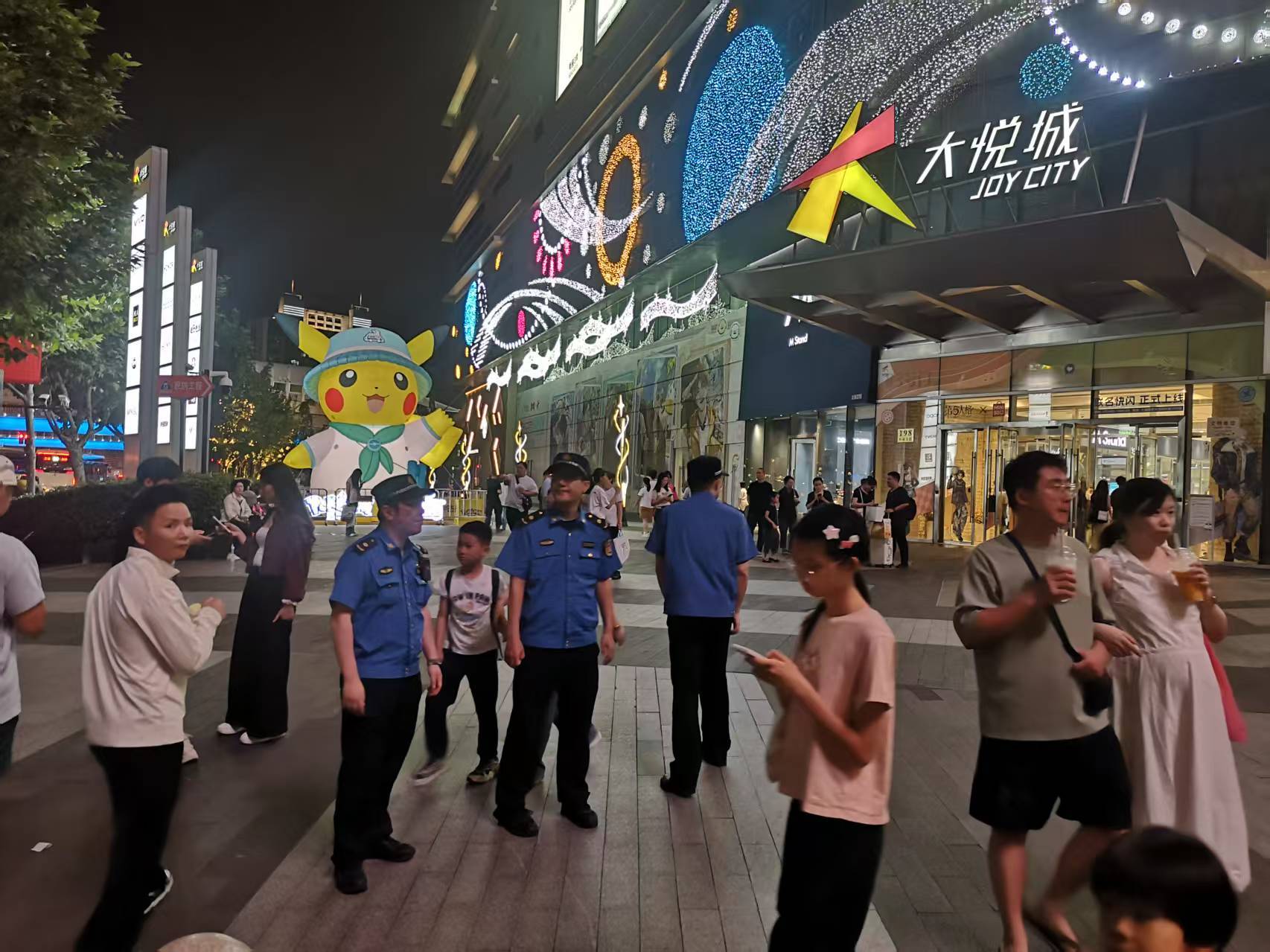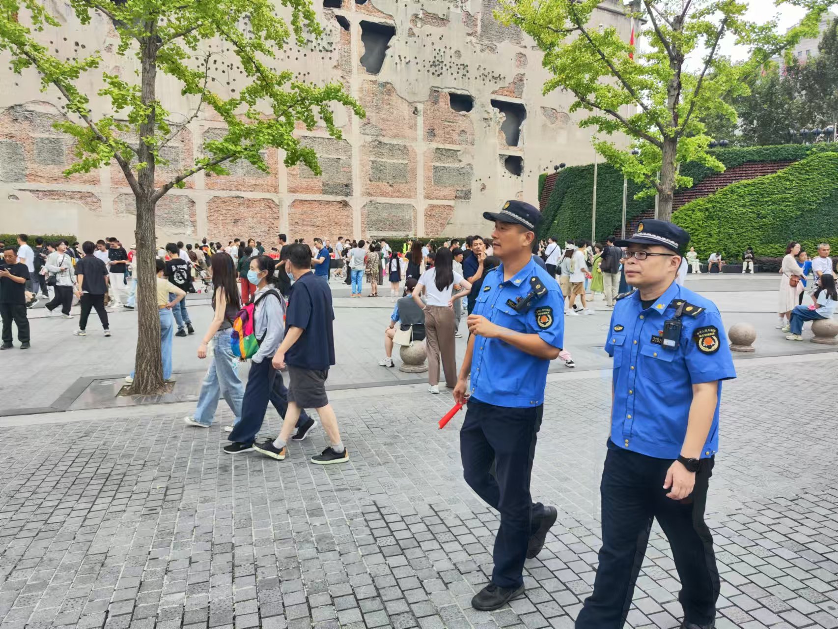 夜间观展时段,天气闷热,游客众多,安全隐患随之增加。队员们不断进行安全提示:“请拿好您的水瓶,不要随意丢弃,防止误踩滑倒”、“家长请看好自己的孩子,注意安全,不要追逐打闹”、“抱小孩的家长,请尽量站在靠内侧的位置,与平台边缘保持距离,以防拥挤”、“你好,这里人流量大,共享单车请勿停放在这里”。一句句温馨的提醒,传递着温度,也织密现场的安全防护网。他们始终固守直至光影秀散场,确认现场安全后,才有序撤离,继续投身于辖区其他点位的夜间巡查工作。