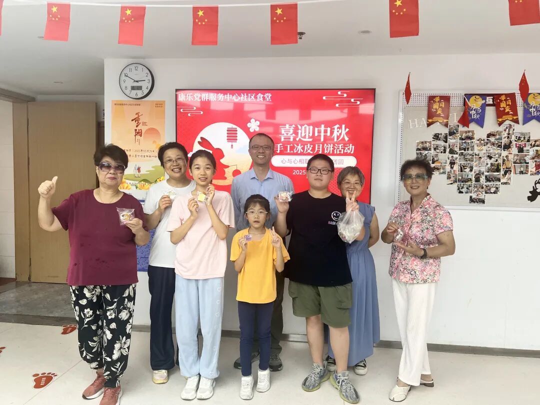 康乐党群服务中心社区食堂邀请周边社区亲子家庭开展手作冰皮月饼活动,解锁不一样的团圆味道。在专业老师的指导下,从揉面到包馅儿,再到压模,每一个步骤都充满了乐趣。不一会儿,一枚枚形态各异的月饼便摆满了托盘。待月饼出炉,金黄的外皮裹着香甜的内馅,居民们纷纷拿起自己的作品拍照留念,或当场品尝,或打包带回家与家人分享。