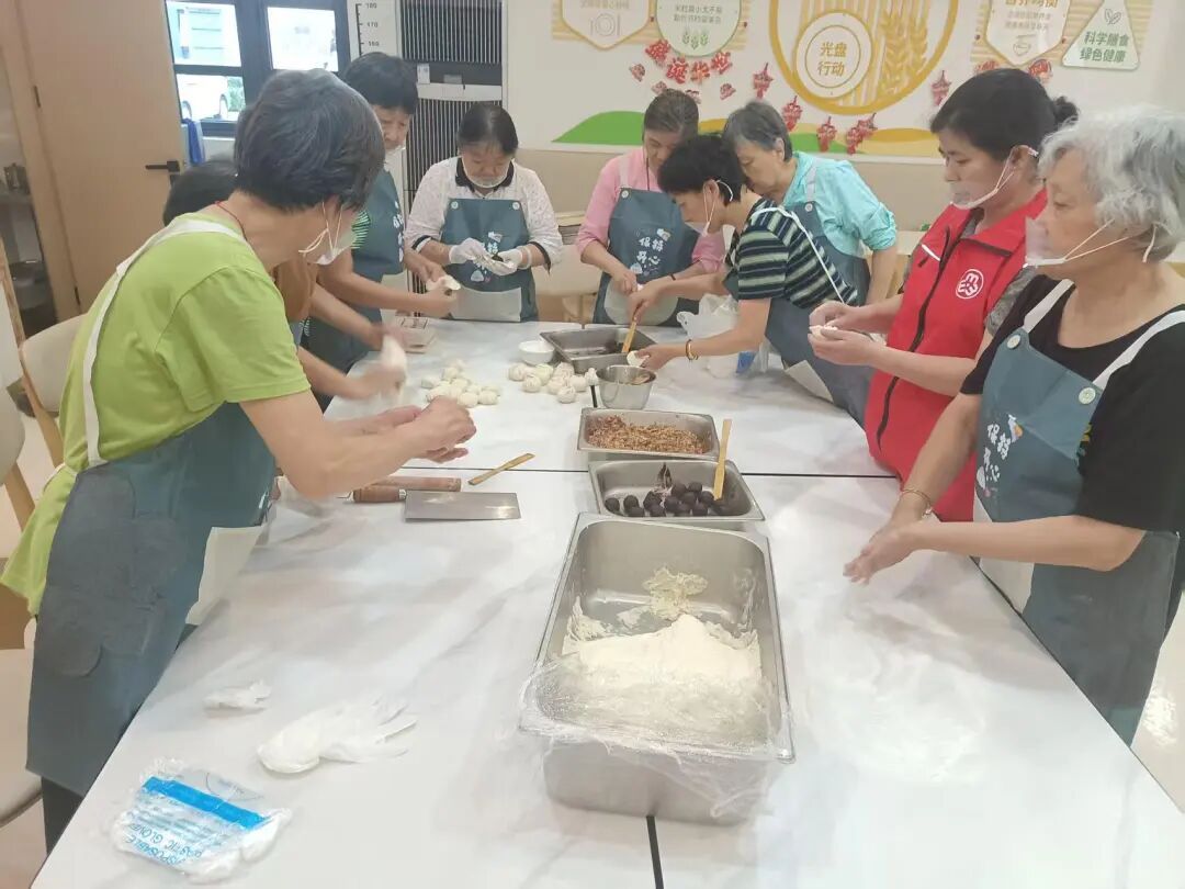 康新党群服务中心社区食堂则把“团圆”捏成了包子。食堂师傅提前备好松软的面团和鲜香的荤素馅料,居民们踊跃参与。有的跟着师傅学习擀皮技巧,有的熟练地包着包子,还有的互相交流着包包子的小窍门,老面醒发、馅料现拌,大家擀皮、挑馅、包褶,像把儿时的灶台搬回了眼前。当一笼笼包子蒸熟出锅,浓郁的香气扑鼻而来,咬上一口,满满的家常味道。