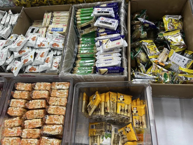 还有一类摊位,是年轻人最爱流连的“怀旧角落”:散装零食堆在纸箱里,不起眼却真实。一位女孩笑着说:“小时候吃的红条纹饼干,网上找不到,来市场一眼就认出来了。”
