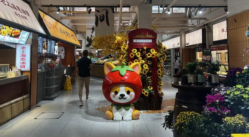 这里不大,但摊位设计讲究、物品摆放精致,散发出一种“高级又烟火”的气质。入口处的红色电话亭堆满鲜花,旁边一只小狗玩偶静静守候——成为不少年轻人拍照打卡的第一站。