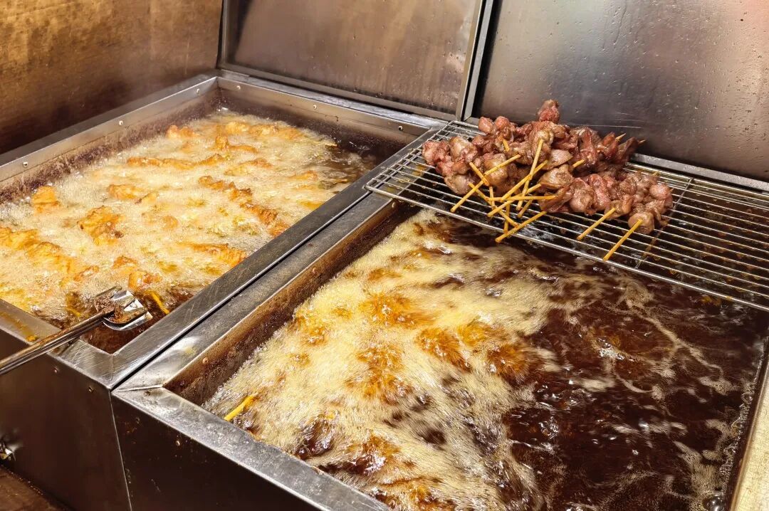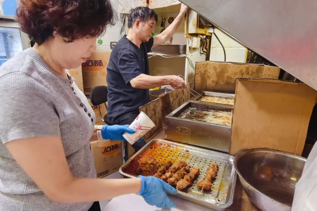 记者了解到,店主一家人在店里分工协作,早上5点就要去菜市场采购当天所需的新鲜猪肉,经过四五个小时的精心腌制,再切成块、串成串,放进冷藏柜里保鲜。下锅油炸时,一次能炸40串,短短5分钟就能炸好。待出锅后,只需撒上一层辣椒和孜然,搭配简单却让咸、香、辣的滋味完美融合。