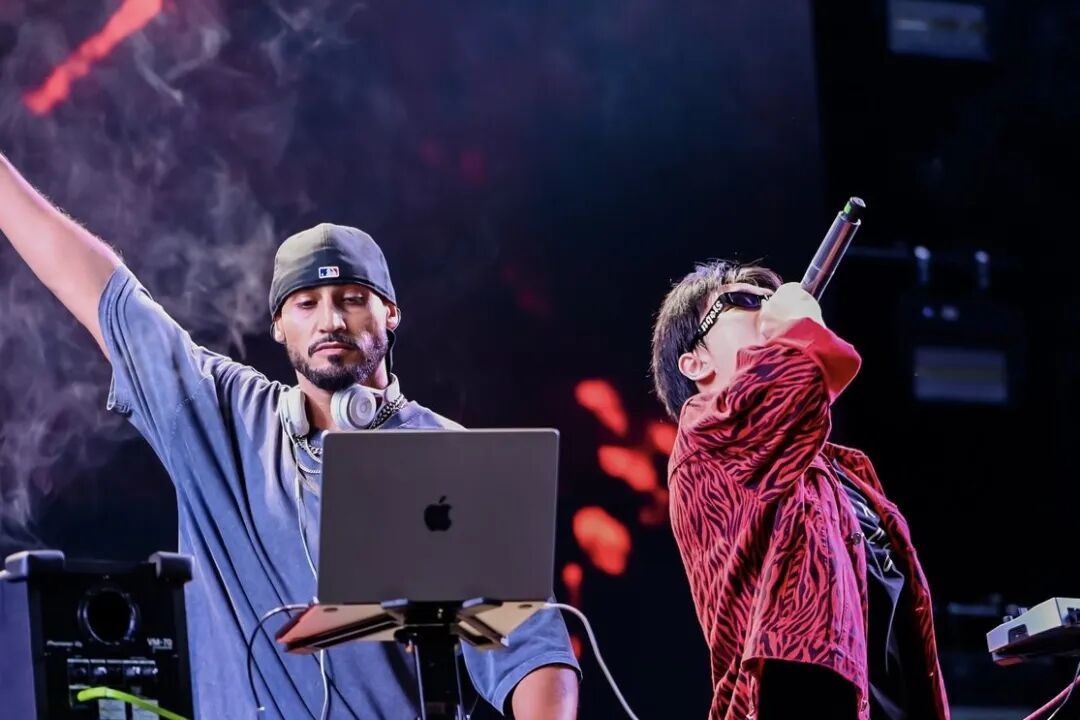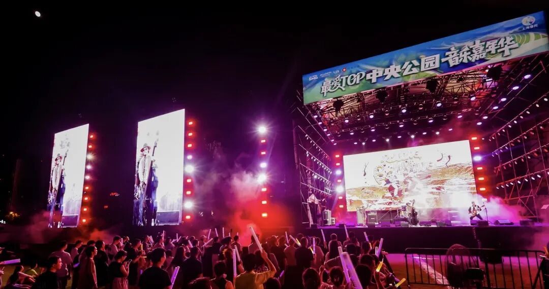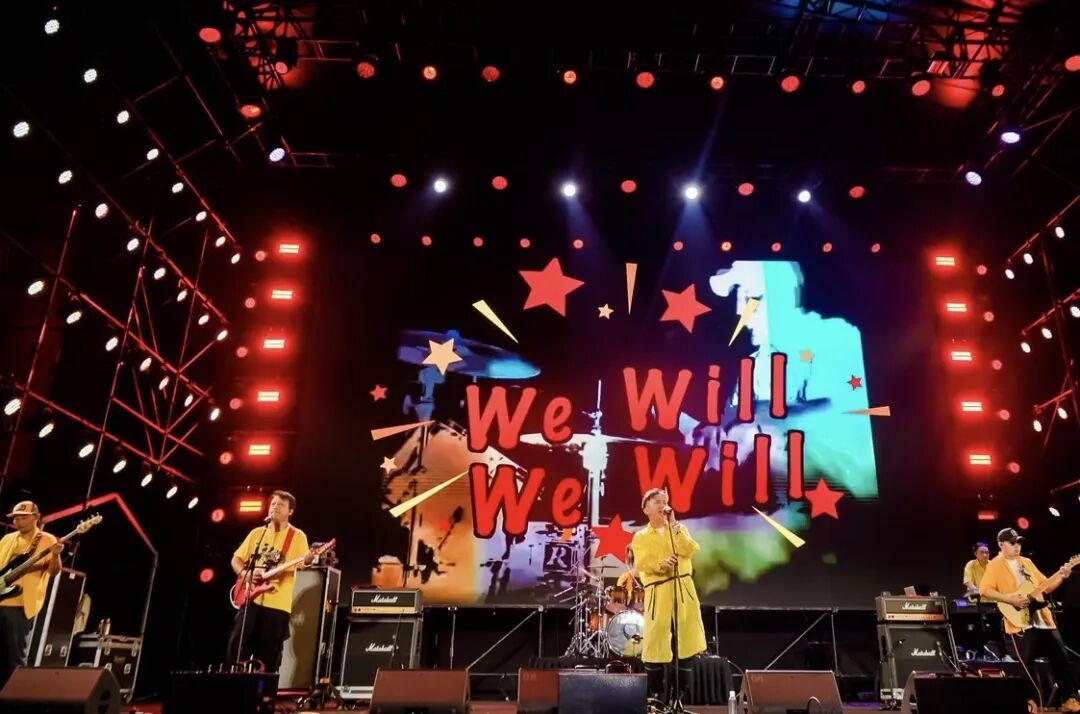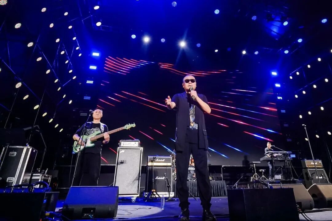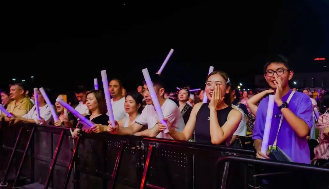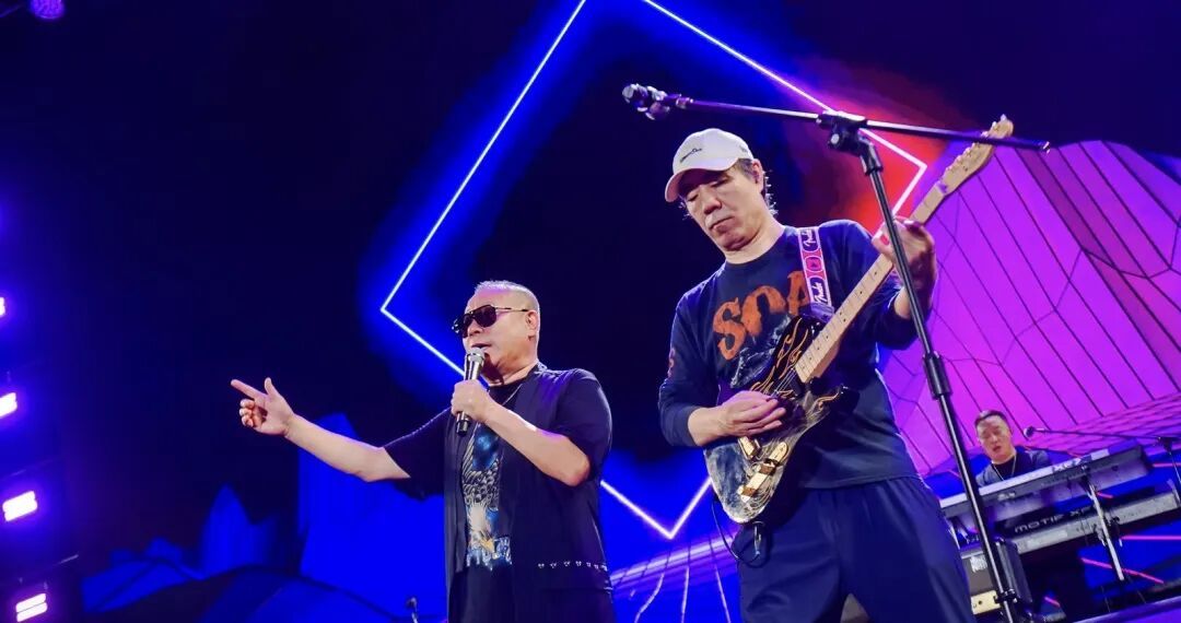 随着夜幕落下,舞台炫丽的灯光柱直冲夜空,主持人歌会的温情余韵未散,更强劲的声浪接踵而至。法国DJ KADWELL与MC J.Chen接棒登场,用强劲电子节拍引爆现场。随后,844乐队、永夜极光乐队、旋转保龄乐队等轮番上阵,风格多元的摇滚乐持续点燃气氛。当“零点乐队”唱响《爱不爱我》《永不放弃》等经典曲目时,全场跟唱,声浪震天,将夜晚推向高潮。