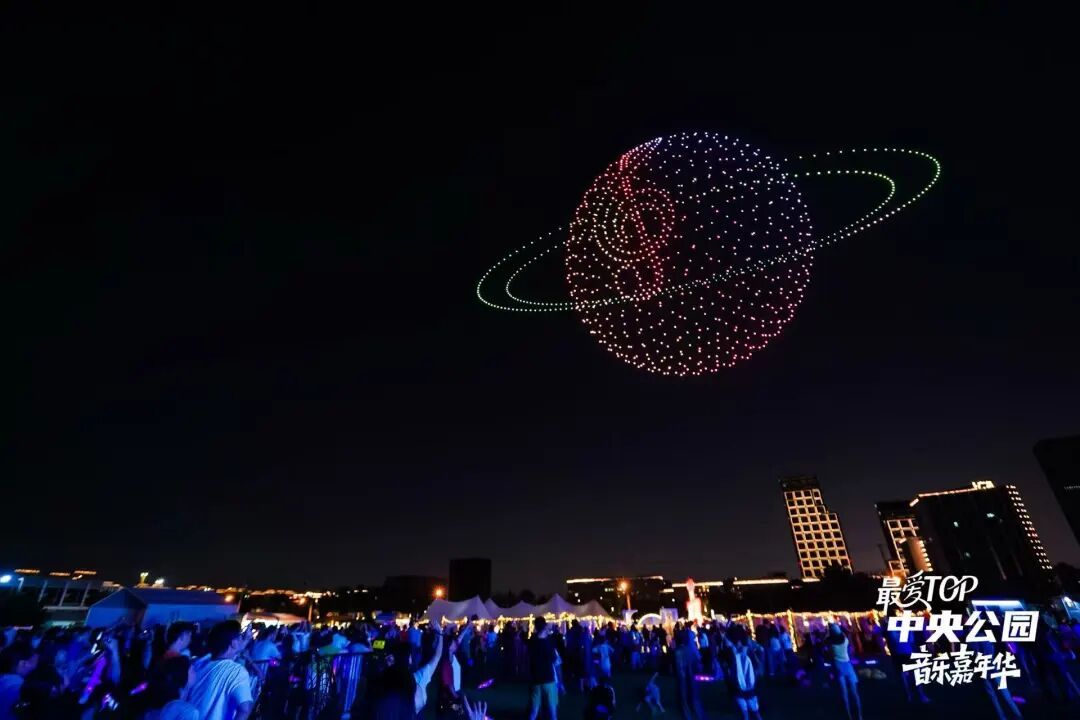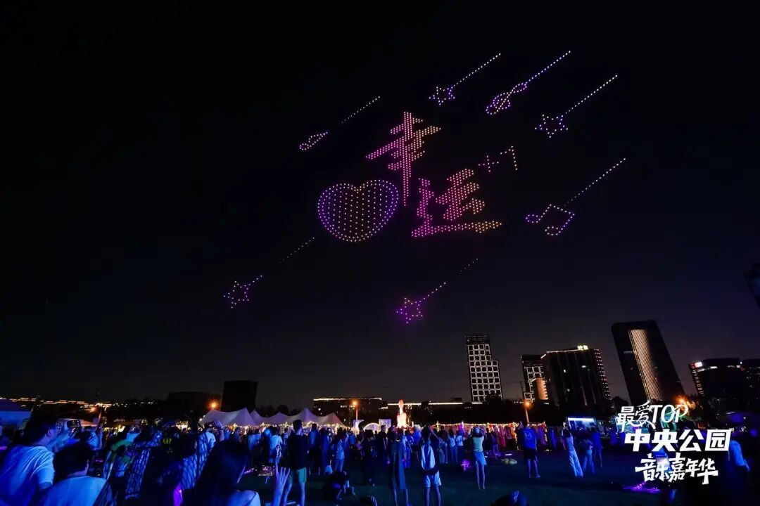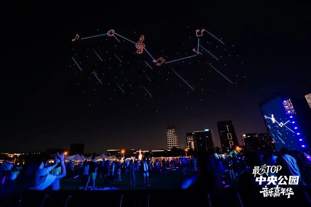 晚间21时30分,千架无人机在普陀区的科创企业高巨智创的操作下腾空而起,在TOP中央公园的夜空中展开长达20分钟的“TOP星幕”表演。变幻的灯光图案为当天的音乐演出划上完美句点。