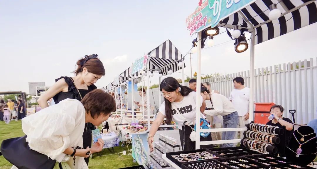 音乐节现场同步开设的主题市集人气旺盛,东方明珠潮玩馆、浪浪山小妖怪等IP展位前聚集着拍照的人群。非遗文化摊位呈现糖画、缠花等传统手艺,与邻近的美食餐车、创意饮品形成传统与现代的趣味碰撞。“半马苏河”品牌文创则将以苏州河风景为灵感的纪念品带给游客。