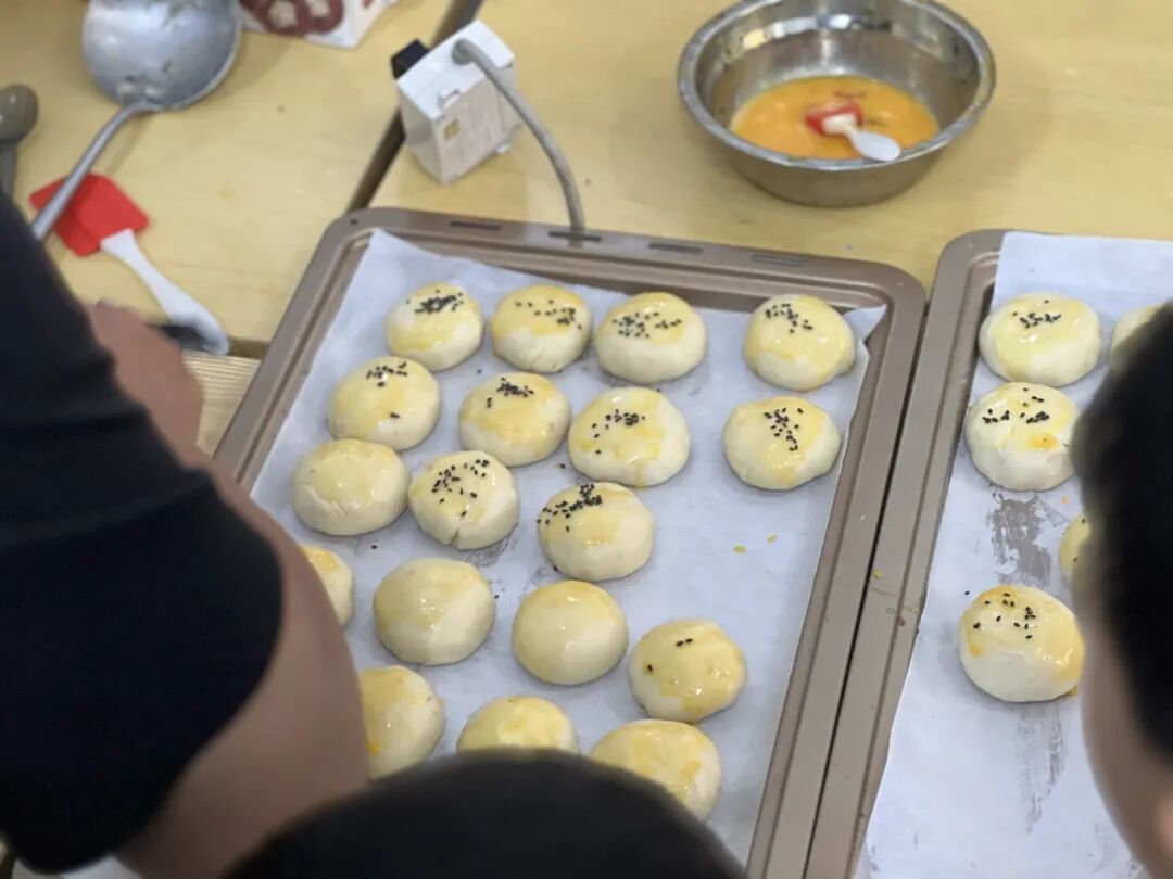 绘本共读环节结束后,孩子们集体步行至一街之隔的香阁丽苑社区活动中心。在这里,一场欢乐温馨的月饼制作已经准备就绪。