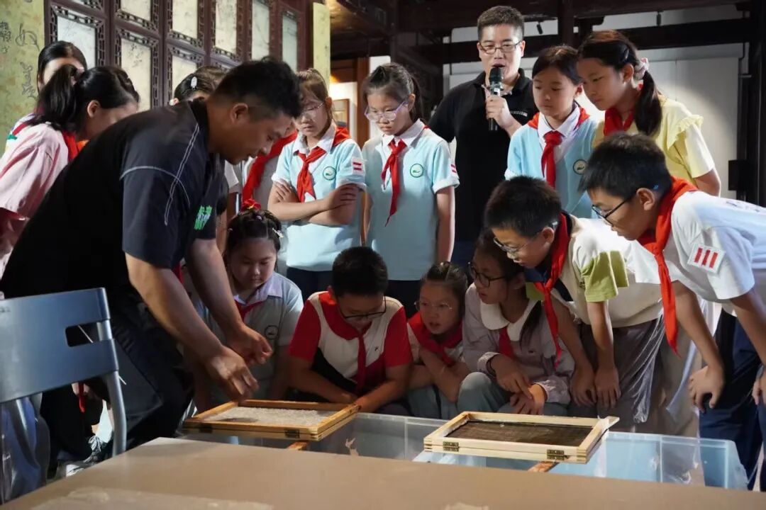 抄纸帘一起一落间,古老的造纸术成为孩子们爱玩的“手工课”。9月26日,程十发艺术馆内纸香满庭,上海市松江区教育学院附属实验学校的20名小朋友在粉墙黛瓦间开启了一场宣纸制作研学之旅,破解“纸寿千年”的非遗密码。这也是程十发艺术馆首次开设系列研学课。