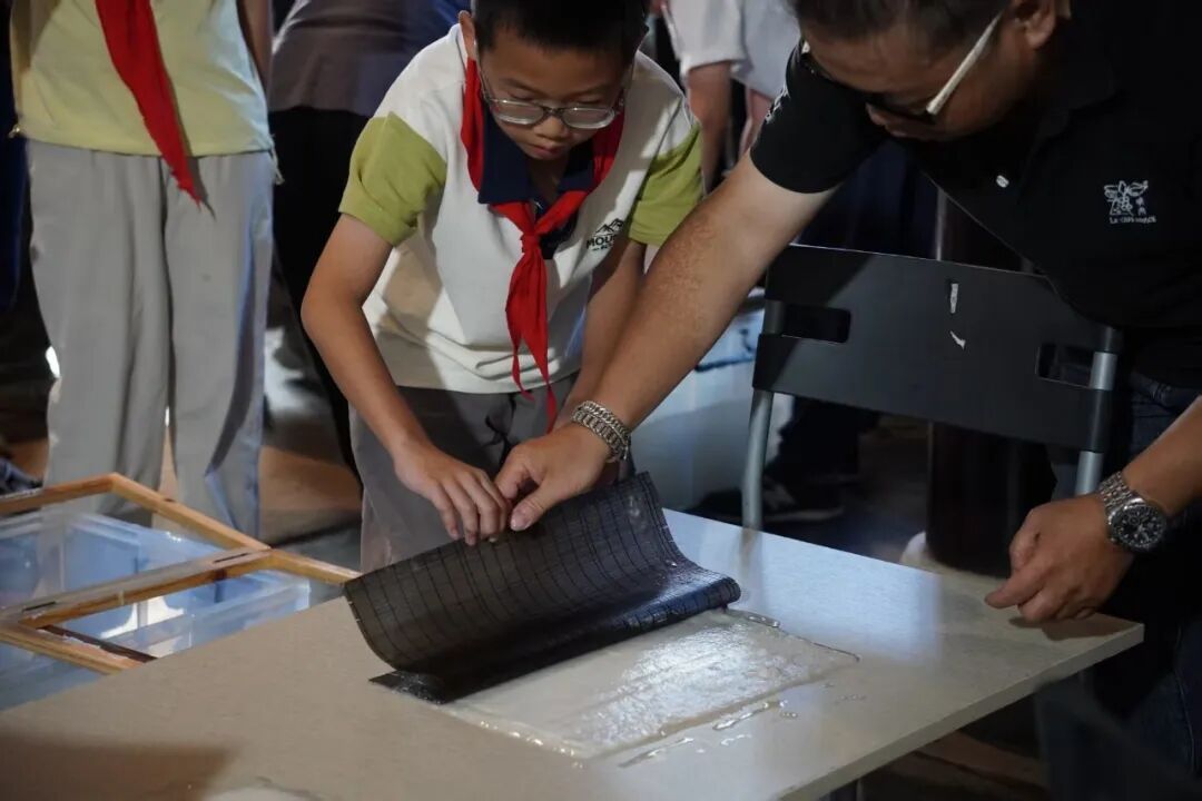 活动现场,生动的三维动画让孩子们看到了造纸术中七十二道工序的精妙,并在老师的讲解中一一辨识了宣纸、连史纸、罗纹纸等20种传统纸张。实操环节,孩子们在非遗老师的带领下,围着纸浆池体验了“荡料入帘”“覆帘压纸”等古法工序。洁白的宣纸从竹木抄纸帘上揭下,当看到纸张洁白均匀、没有丝毫破损时,10岁的张涵不禁欢呼起来:“我刚刚一直在观察老师的手法,不靠蛮力而靠巧劲儿。现在第一次尝试就成功了,太有成就感了。”另一边,10岁的王诗妍边说边示范:“宣纸原料有沙田草、树皮,纸浆很容易沉淀,捞纸要慢下慢起才均匀。”她已从初次操作的手忙脚乱变得娴熟,按压纸张挤水的动作颇有章法。看着一张张做好的湿纸叠在一起,她好奇地询问它们为什么不会粘连,老师揭秘道:“猕猴桃藤汁就像‘纸的卤水’,其胶性能让纤维凝结成型,这和卤水点豆腐是同样的道理。”