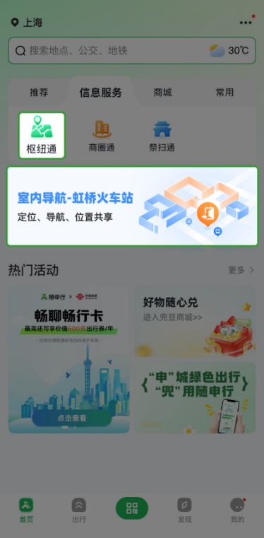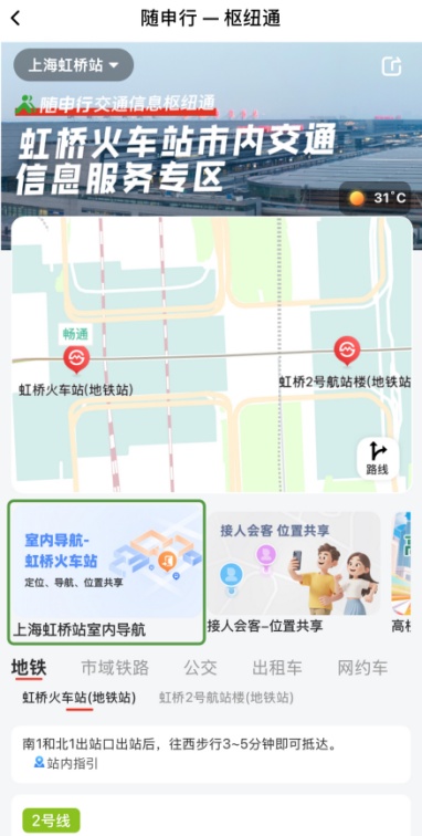 入口二: “随申行”平台(APP、微信小程序)首页入口,或点击“枢纽通”进入上海虹桥站,点击室内导航启动服务