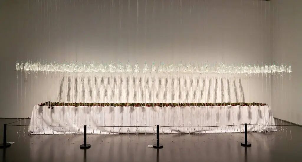 《一念之间的差异》为2000年上海双年展重点参展作品:艺术家将一千朵玫瑰静置于铺有白布的长桌之上,犹如安卧于病床。葡萄糖液通过静脉输液管缓缓注入每一枝玫瑰,短暂地延续其绽放时刻——明媚的色彩与沁人的芬芳,仿佛是对生命绚烂的礼赞。然而再美的玫瑰终将凋零,正如输液设备虽能延续生命,却无法阻止最终的逝去。在这一念之间的张力中,艺术家将友人赠送的玫瑰转化为这件富有意味的装置,意图延长一切美好事物的存续期限,亦在唤醒观者对生命、短暂与永恒的沉思。尤其在今天,作品还可提供现实的精神疗愈价值,观众可在输液袋标签上自行书写“药方”如阿司匹林、黄连素,亦或是理解和宽容、慈悲和智慧、无限的支持、信任等心灵良剂,以此参与对话,在互动中完成对自我与他人的象征性疗愈。