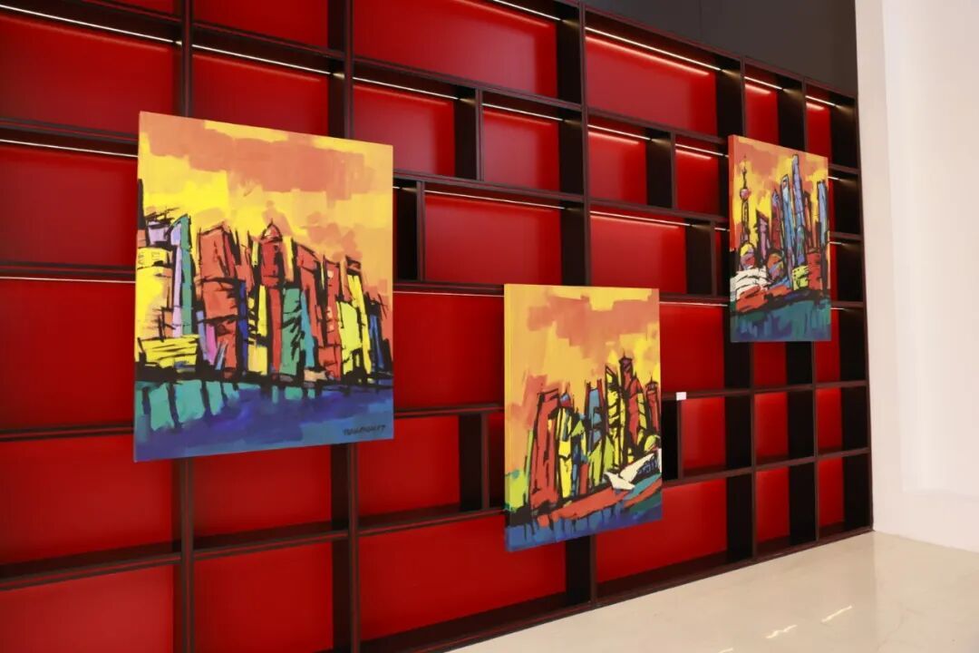 经典之作《上海之眼》运用橘红、玫紫与钴蓝等夸张色调表现了陆家嘴建筑群从“隐匿”到“显现”的过程,形成强烈的视觉张力。《上海陆家嘴印象》展现的是气势恢宏的城市全景,细看则可见东方笔意的细腻表达,通过高饱和度的钴蓝、绛紫与鎏金等色调,突破传统建筑写实范式,形成强烈的视觉冲击力。“晨晓的艺术创作始终游走于存在与显现的边界之上,在这些充满光色变幻的画布上,城市不再是冰冷的建筑集合,而是存在者得以展现其本质的场域,由此开启了一场关于可见与不可见、真实与建构、栖居与流动的思辨之旅。”惠书文说。