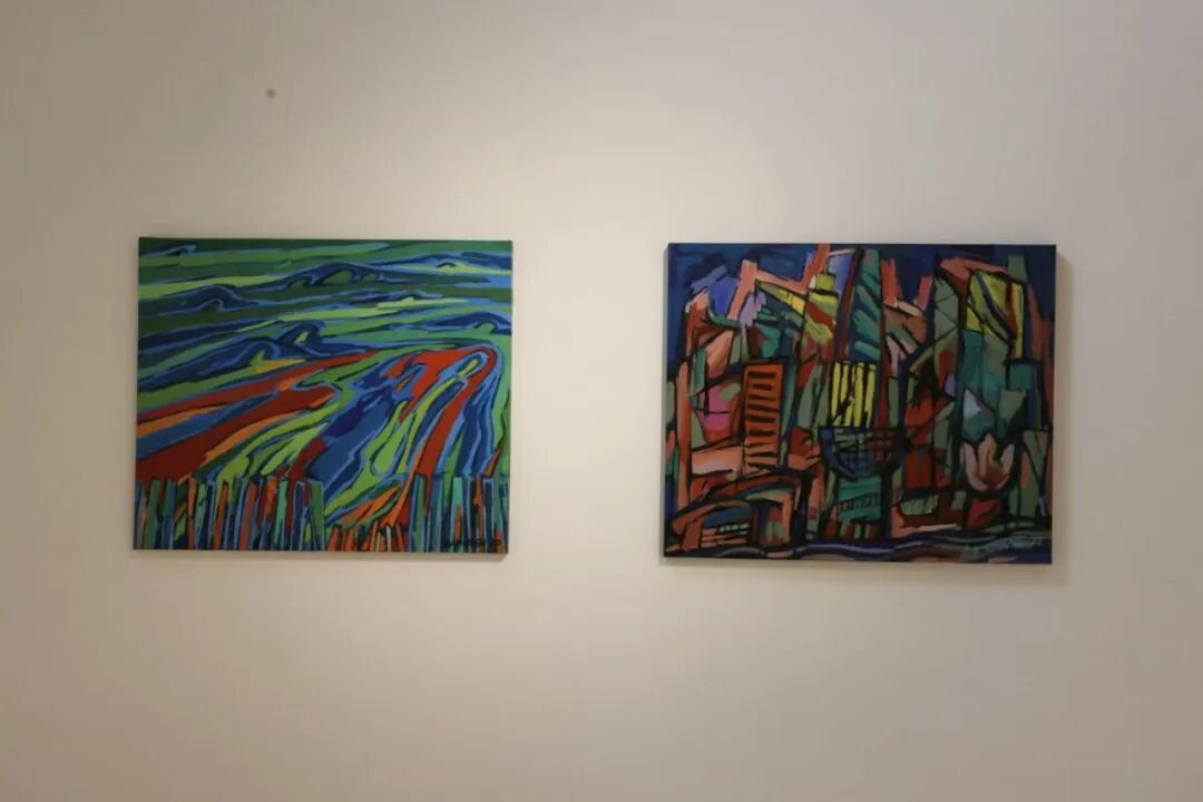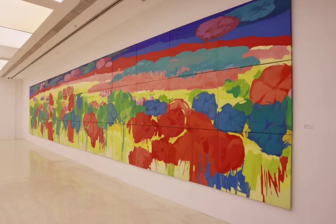 展厅中最引人注目的便是晨晓的代表作《一池荷叶》,这幅15米的长卷中,荷叶并不是传统意义上的一片碧绿,而是采用柠檬黄、翡翠绿、映日红形成强烈视觉冲击。“这幅作品通过对比色与协调色的并置重构东方美学表达,以主观化色彩表现自然物象,将西方表现主义色彩与中国水墨写意精神完美融合。”策展人惠书文介绍。