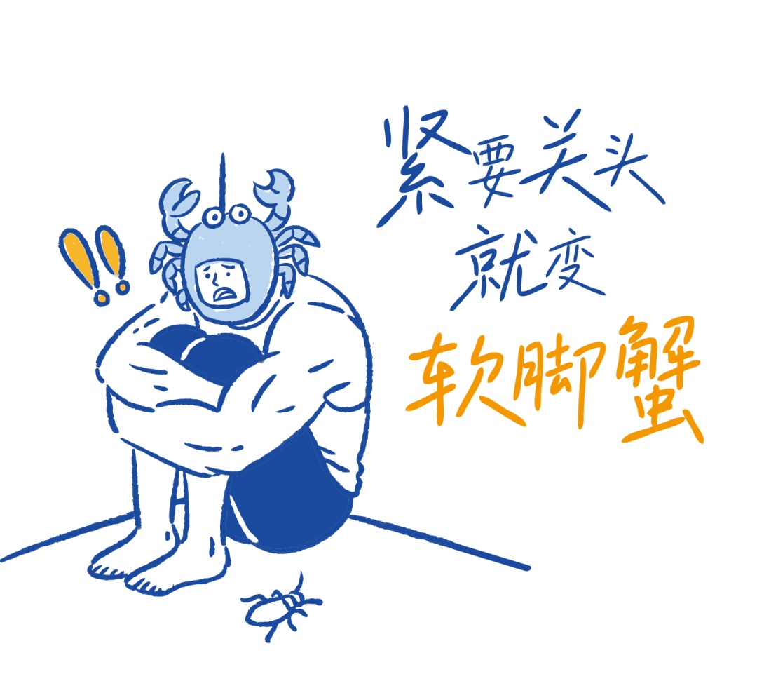 2.伊是只软脚蟹,看上去长一码大一码个,碰到一点点事体就缩脱了。(这个人遇事软弱无能,看着人高马大,碰到一点小事就怂了。)