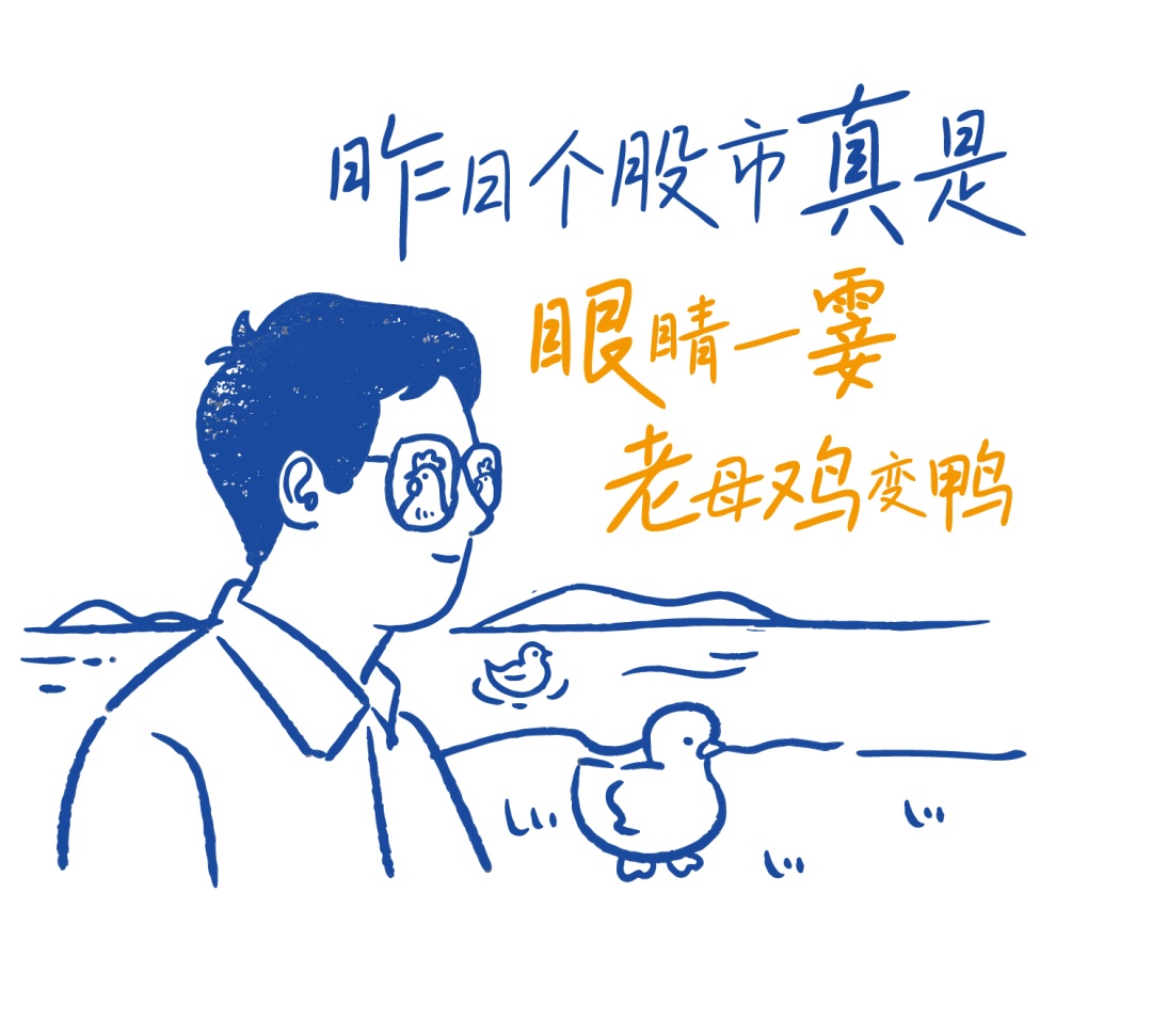 1.哎呦!昨日个股市真是眼睛一霎,老母鸡变鸭。(哎!昨天的股市真是变化太快了!)