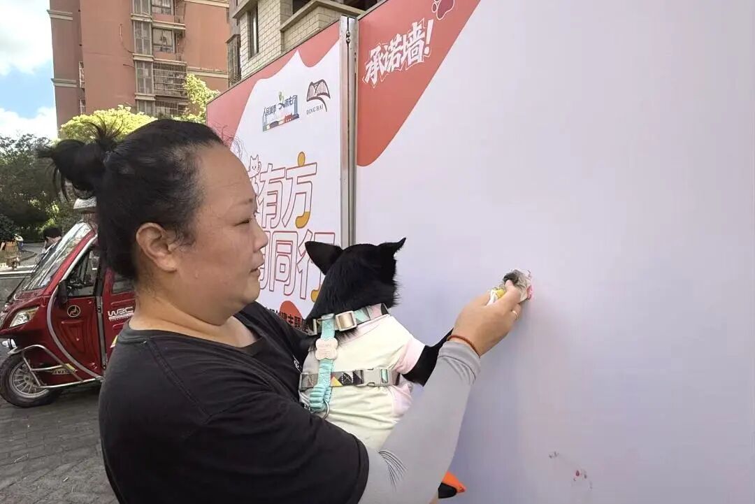 活动现场,“文明‘萌’约”承诺墙前挤满了养宠居民。不同于常规签名环节,这里的“约定”更具温度——居民们郑重签下姓名,“毛孩子”们则在工作人员的协助下蘸取环保颜料,在签名旁按下彩色爪印。