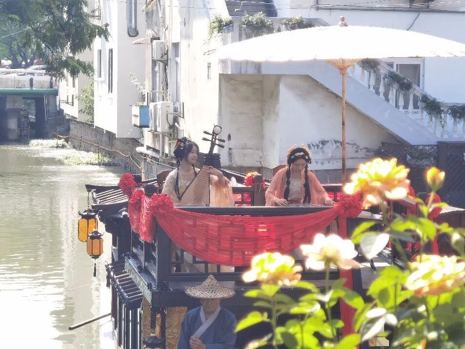 伴随着演员的指尖在弦上翩跹起舞,《双面燕洵》《新贵妃醉酒》《卜卦》等一曲曲古今融合的柔美的音符随之跳跃而出,令桥上游客不自觉驻足,沉浸于“舟行碧波上,人在画中游”的诗意场景。
