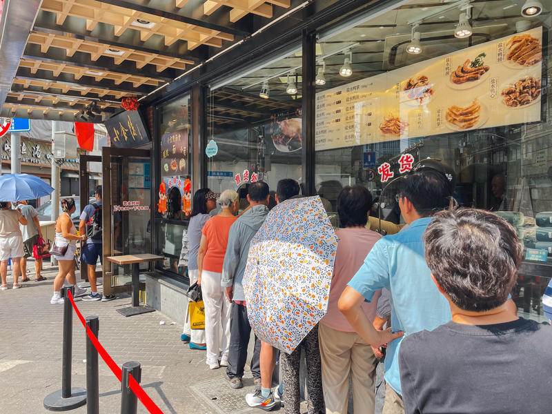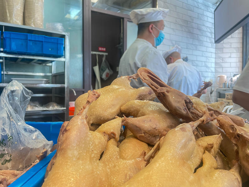 要说上海哪里的盐水鸭最出名,小金陵盐水鸭绝对算是 “顶流”。记者在位于云南南路上的小金陵盐水鸭门店看到,店里的队伍从门口一直排到街角,热闹得不像话。记者挤在人群里,耳边满是市民的交谈声:“每年中秋都来这买,少了这口就不像过节!” 店员一边麻利地斩鸭打包,一边笑着说:“中秋前这几天,已经快忙得脚不沾地!最近光云南南路店,一天就要卖掉近2000只鸭子,是往常的好几倍。”