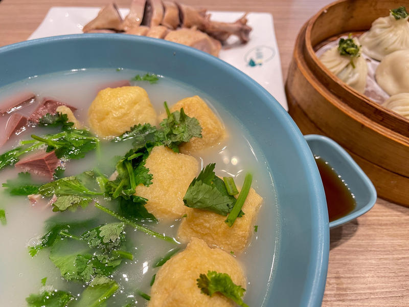 要是觉得光吃鸭不过瘾,店里的金陵汤包也别错过。点上一份经典三拼,咬一口汤汁直流,鲜肉、蟹粉、荠菜三种口味,还特意调了点甜味,特别对上海人的胃口。鸭翅、鸭舌等小食也很抢手,炖得软烂的鸭翅啃着喷香,有韧劲的鸭舌越嚼越上头。而店里的老鸭粉丝汤,也十分可口,汤里满满的堆着鸭血,鸭肠等食材,胃口小的人可能喝上一大碗就会饱了。