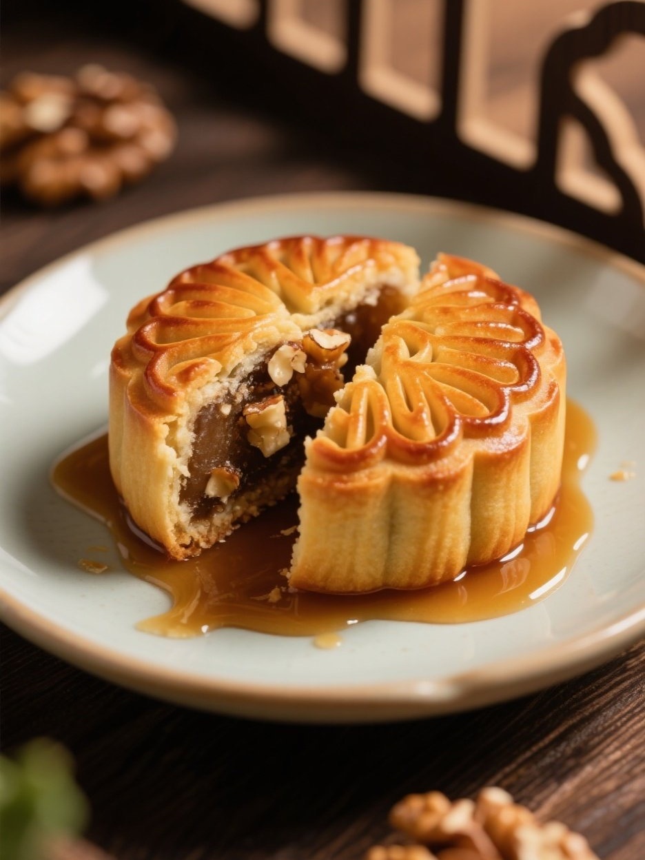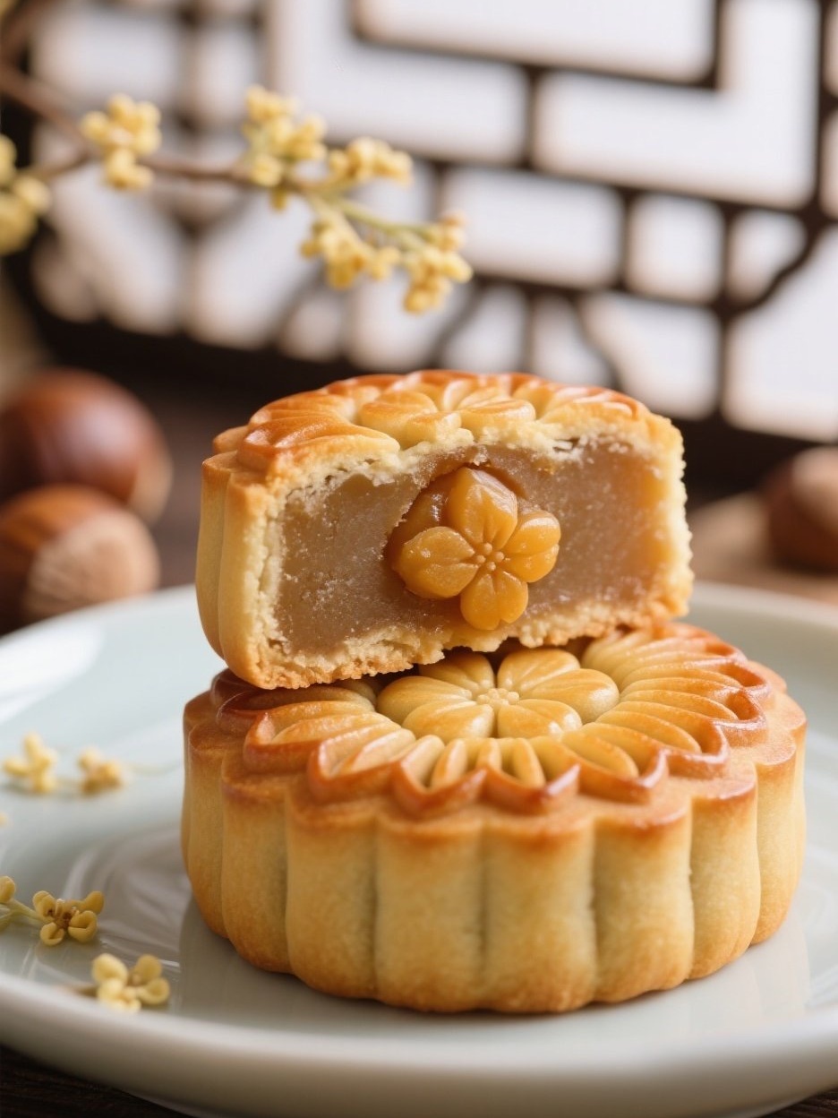 春有樱花、秋有落叶,顾村公园是宝山的“城市绿肺”,也是中秋全家赏月的“后花园”。馅料用板栗(现炒研磨,保留自然甜糯),搭配桂花蜜(点缀公园秋日的桂香),酥皮印樱花花瓣纹(四季流转,团圆常在)。